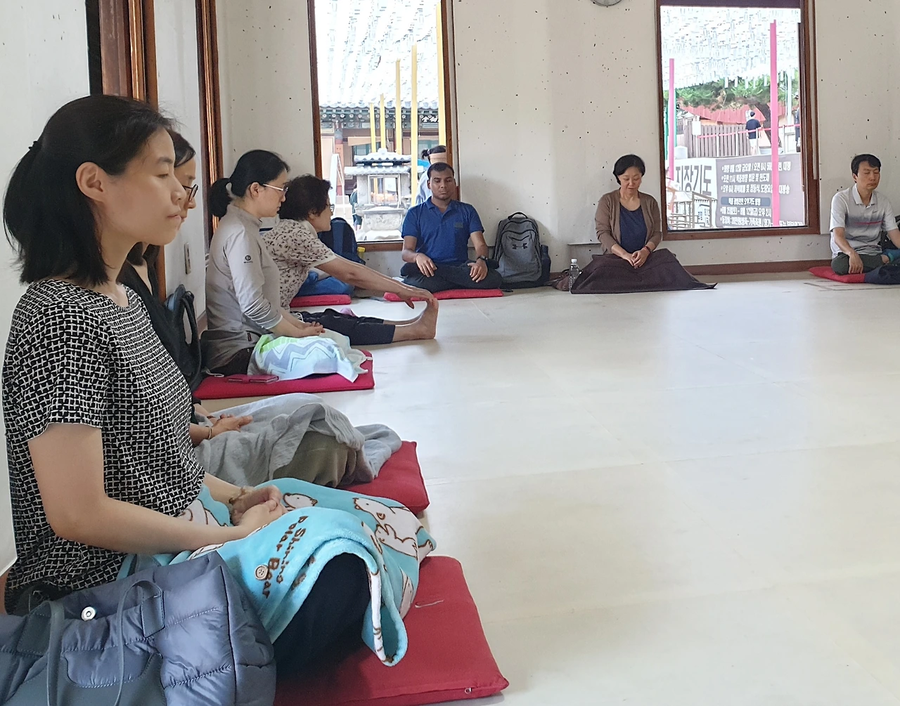인도에 위치한 삼성에서 일하는 인도인 엔지니어들도 지나가다가 들어와서 자연스럽게 함께 했습니다. 처음엔 그냥 구경만 하겠다고 했는데, 제가 새로온 학생에게 자세에 대한 설명을 하는걸 같이 듣더니 이 인도에서 온 엔지니어들도 모두 결가부좌로 함께 앉았습니다.