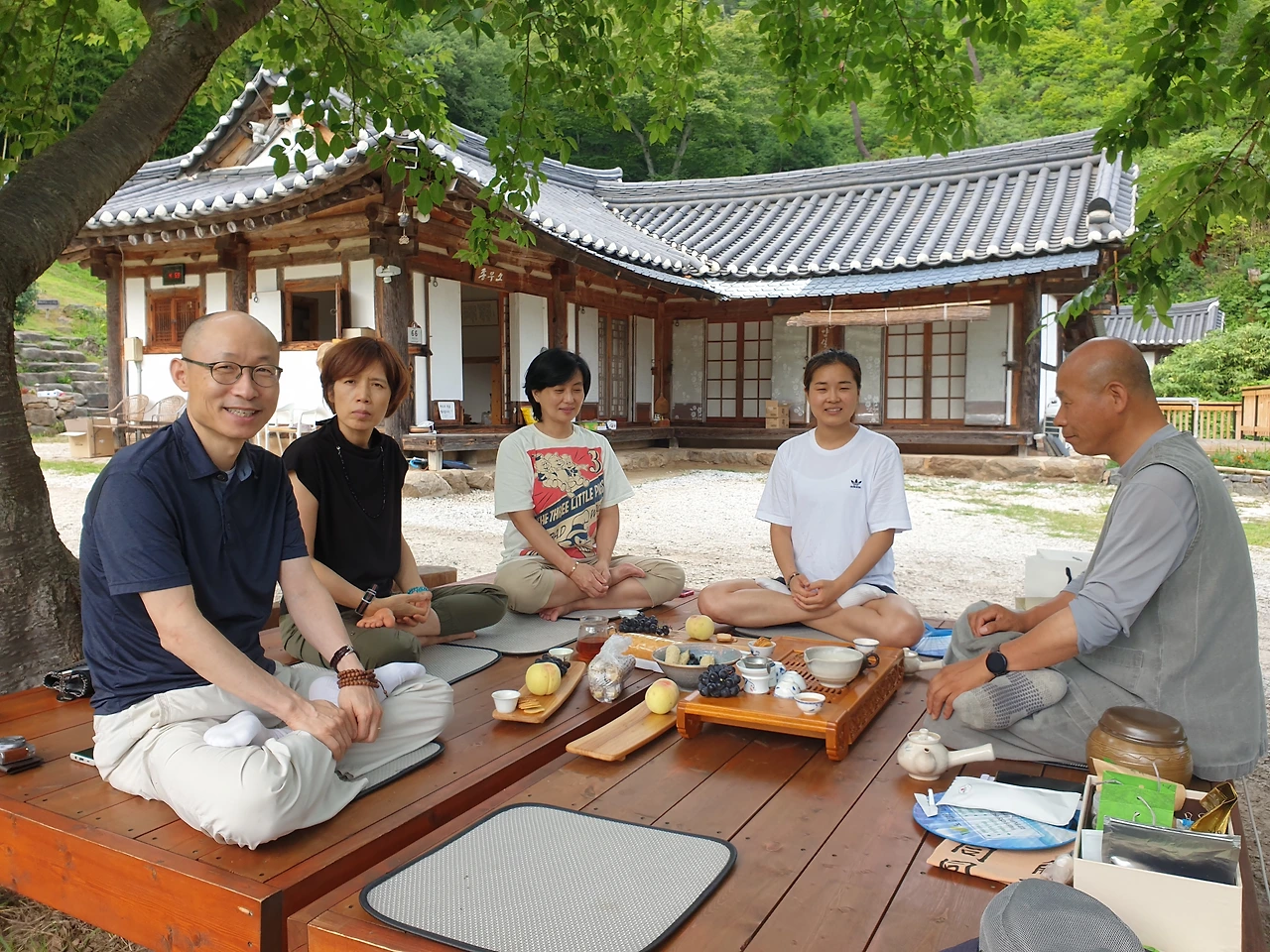 여름인데도 비가 온 후라 시원한 바람이 솔솔 불었습니다. 그래서 나무 그늘에 있는 평상에서 차를 마셨어요. 행선 스님은 오는 손님마다 정성스럽게 이야기해주고, 차를 내어줍니다. 방문한 학생들도 스님과 이야기하고 너무 좋아했어요.