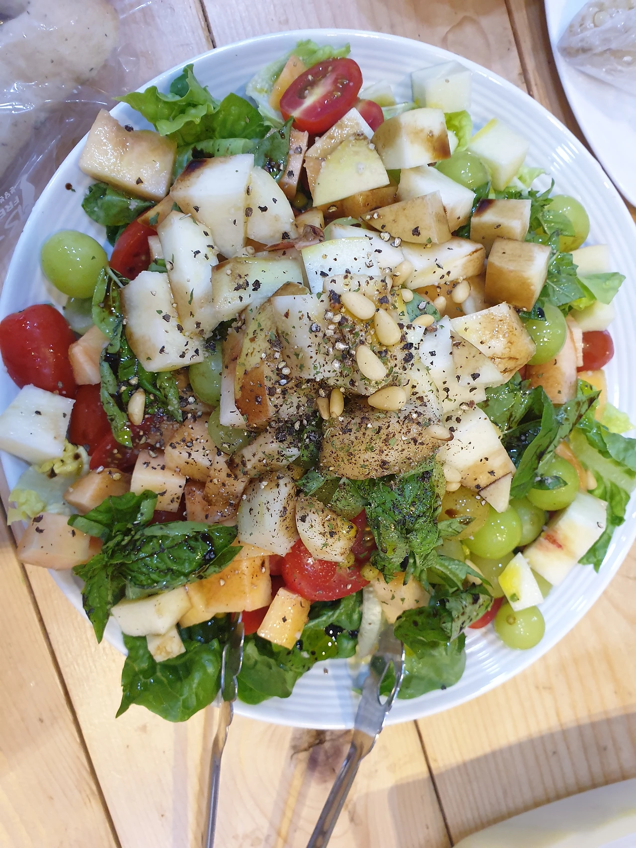 샐러드: 방울토마토, 복숭아, 포도, 병아리콩(쌂아서), 로메인상추, 잣, 바질, 완두콩(통조림), 올리브오일, 발사믹식초, 소금, 후추