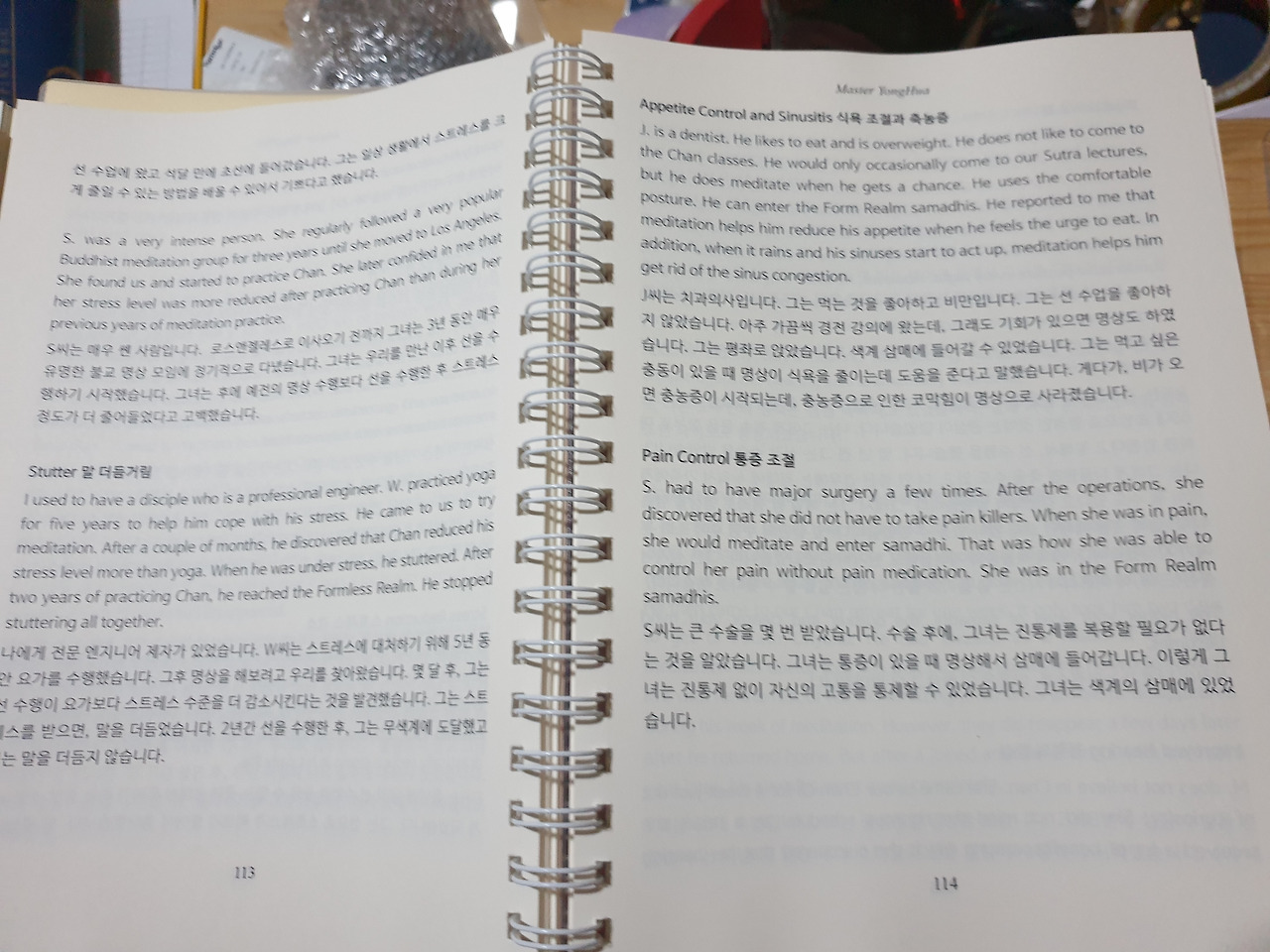 영화 스님의 여러 법문집과 불경 강설집 등을 번역하여 영어 원문, 한국어 번역본을 함께 편집해서 제본해 놓았습니다.