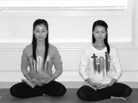 이렇게 앉은 자세에서 손은 무릎 위에 비로자나 수인으로 아래 사진 22와 같이 놓습니다. 양쪽 엄지 손가락을 맞닿게 합니다. 이는 기 순환을 돕는데 중요한 자오선(기가 흐르는 선)을 닫아줍니다.