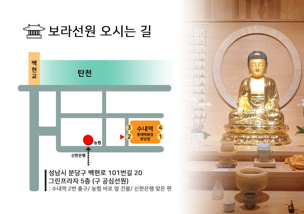 분당 보라선원은 전철을 이용하시면 수내역 2번 또는 3번 출구에서 걸어서 2분 거리에 있습니다. 또는 버스 정류장 수내역/롯데백화점(33번, G8110, 380번) 바로 옆에 위치합니다. 자가용으로 오시면 일요일은 지하주차장에 무료로 주차가 가능합니다.