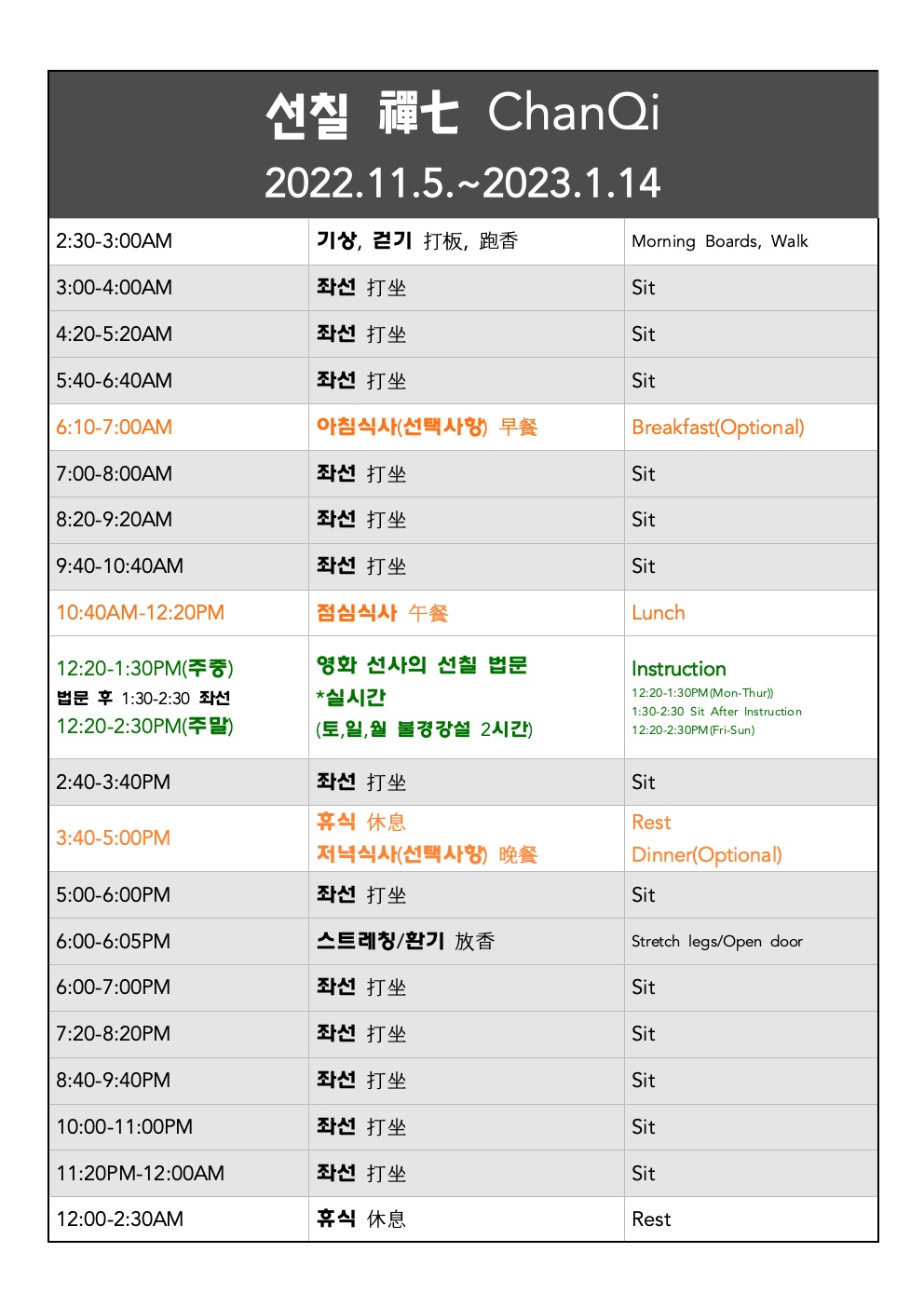 청주 보산사와 분당 보라선원에서 현재 선칠 수행 중입니다. 내년 1월 14일까지 계속 아래 일정표에 따라서 수행합니다. 기본 명상반에 참여했던 분들은 아직 아래 일정을 모두 따라하기 어렵겠지만, 이런 방법을 추천합니다.