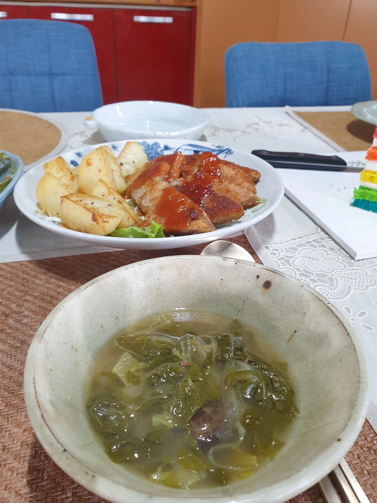 콩고기 돈가스, 된장국,... 푸짐한 점심.