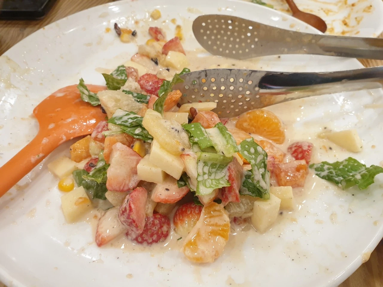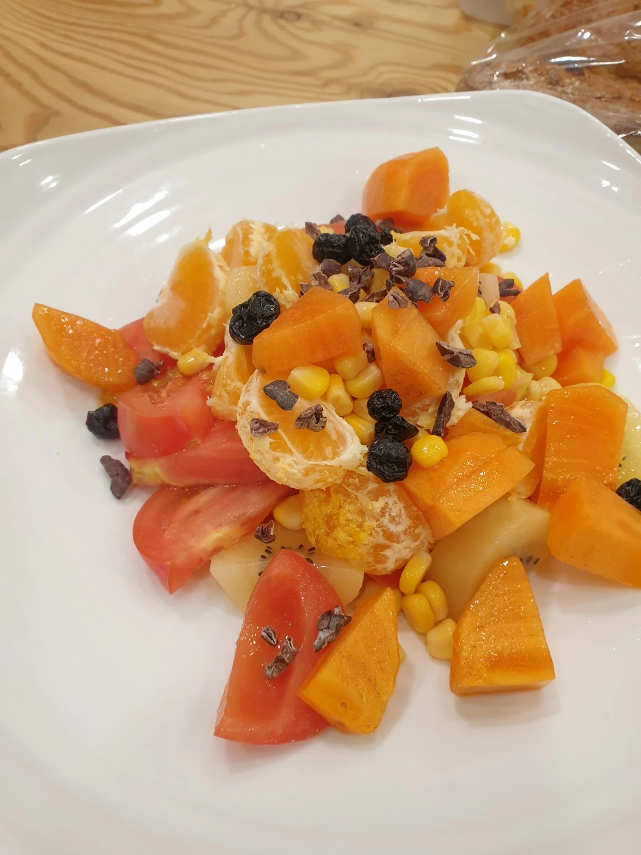 샐러드 상추, 딸기, 키위, 토마토, 카카오 닙스, 피칸, 드라이 블루베리, 귤, 자몽, 사과, 감, 스위트콘 등