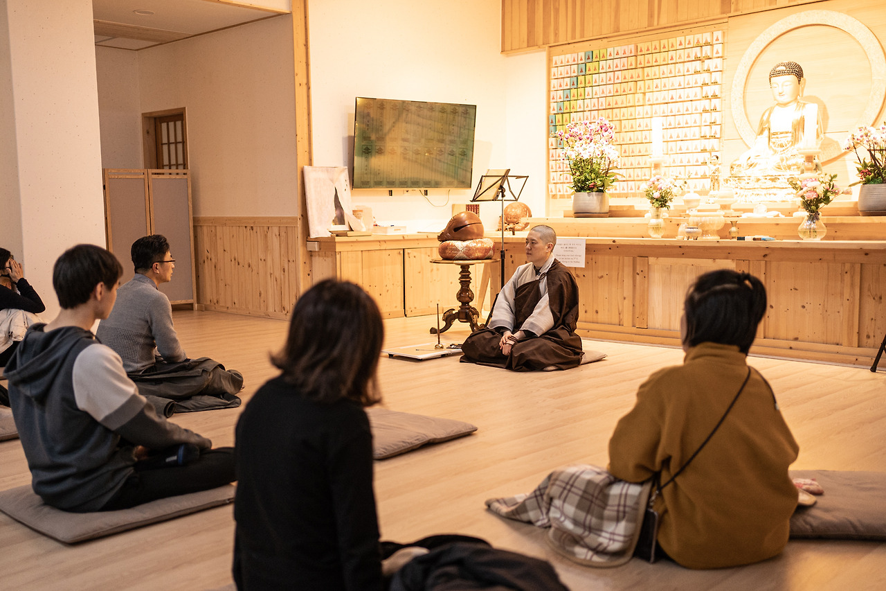 처음 오신 분들과 그동안 함께 했던 분들이 다 함께 모여서 명상하고, 질의응답 시간도 가졌습니다. 명상을 마친 후 현법 스님은 저녁예불과 화엄경 독송을 했고, 처음 오신 분들은 새로 꾸민 차실에서 차담도 나눴습니다.