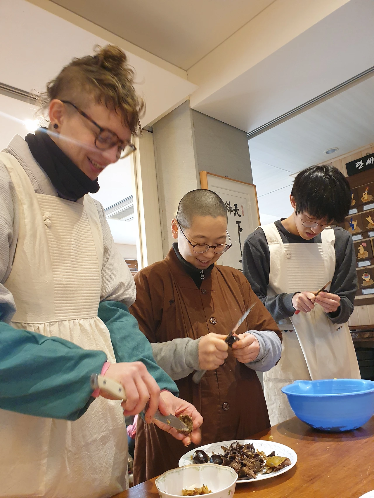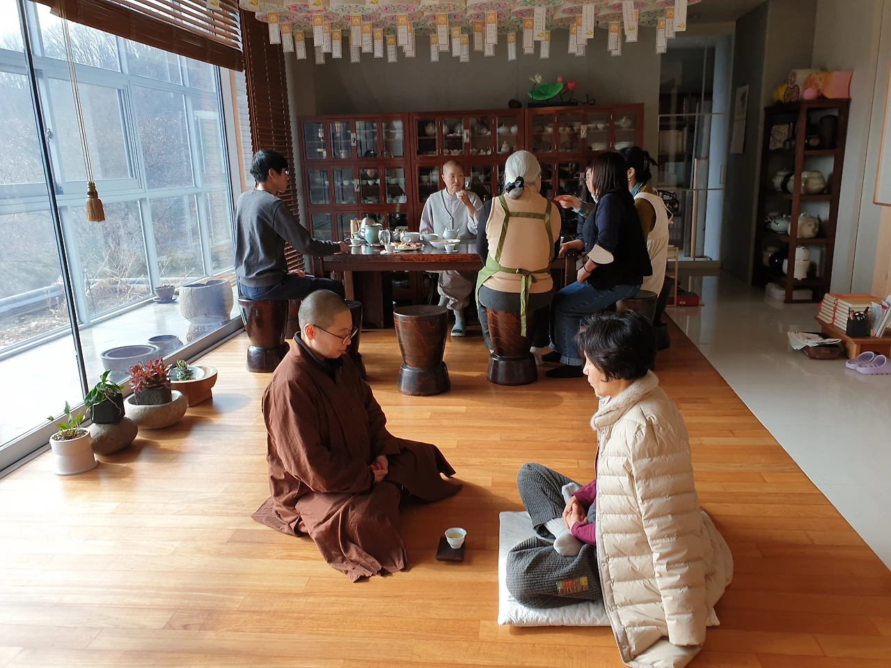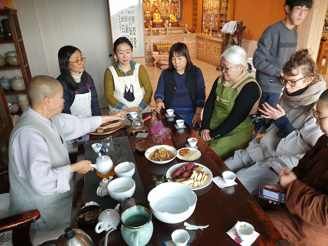 다들 맛있게 점심을 먹었습니다. 설거지를 마치고, 다과와 녹차도 내주셨어요. 프랑스에서 온 로렌에게 특별한 하루입니다.