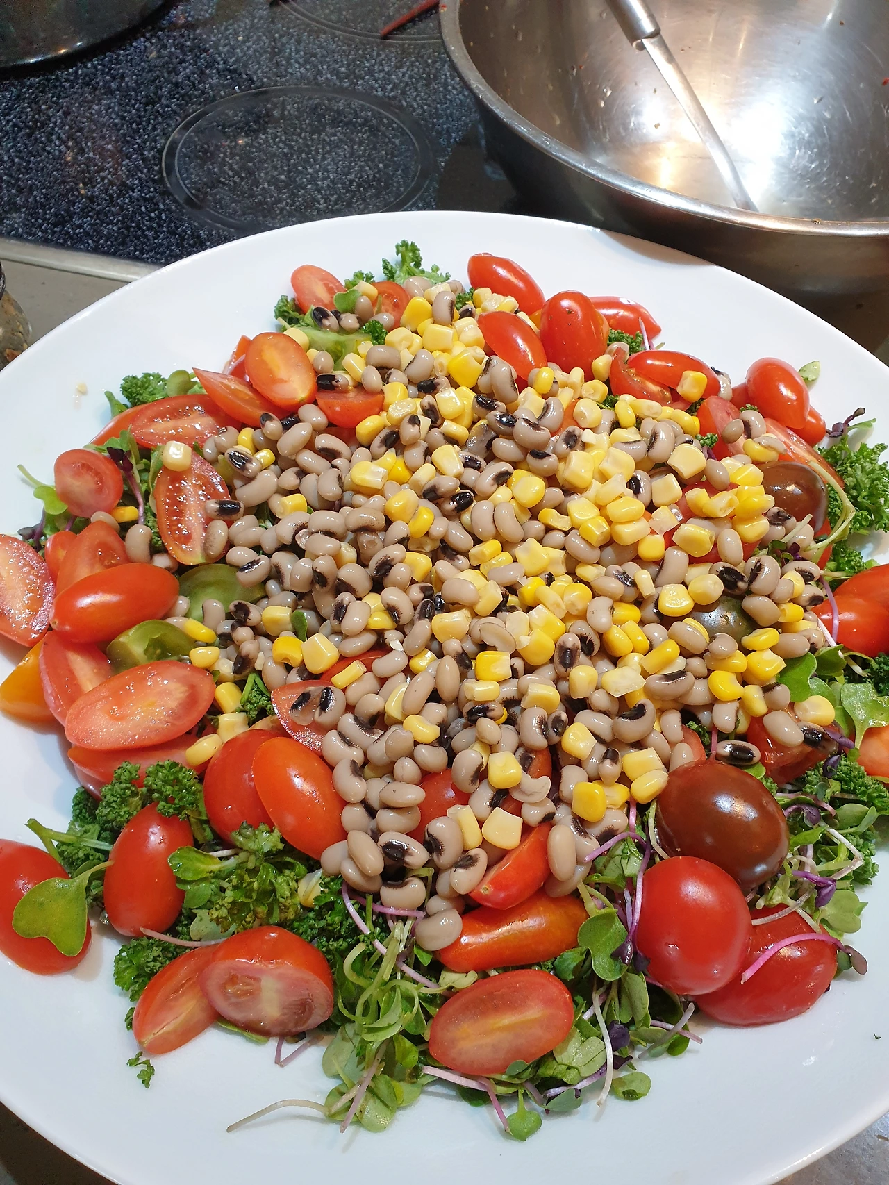 우리는 양송이 토마토 파스타와 샐러드를 준비했어요. 샐러드는 파슬리, 새싹야채, 콩, 카카오닙스, 땅콩, 아보카도, 체리 토마토 등을 넣어서 준비했어요. 드레싱은 그냥 머루포도식초, 올리브오일, 디존 머스타드로.. 간단하게 했습니다.