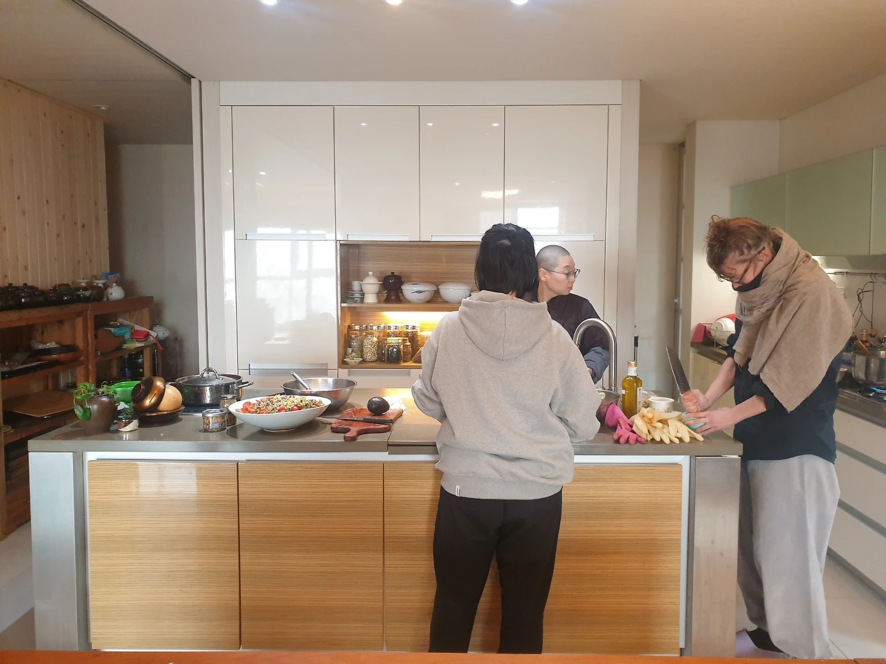 파스타만 해드렸는데, 선재 스님은 이것저것 잔뜩 먹을 것을 챙겨서 싸주셨어요. 젊은 얘들 많이 온다니까 나눠먹라면서 역시 한국은 정입니다.