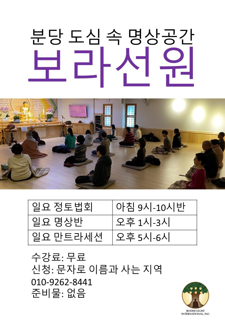 이외에도 분당 보라선원은 매주 일요일 정토법회와 명상반을 진행합니다. 현안스님의 집전과 지도로 진행합니다. 아래 일정표를 참고하세요.