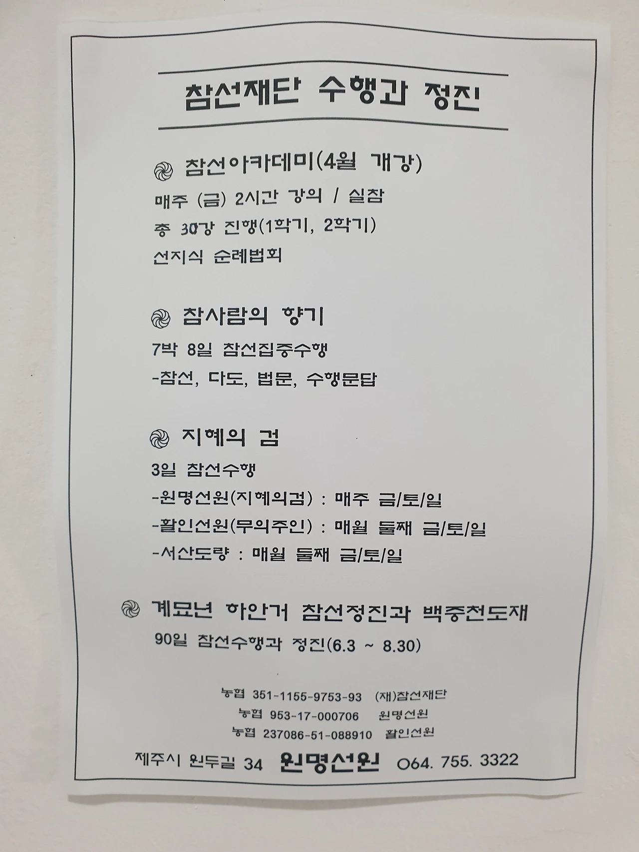 제주도 주민이시라면 원명선원에서 수행을 시작해보세요. 우리 절 신도님도 청주나 분당까지 오시기 어려울 때에는 원명선원 선실이나 법당에서 앉으시라고 권해드렸어요.
