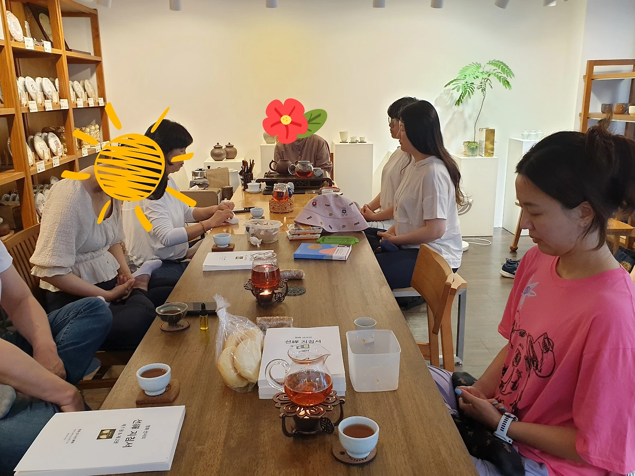 원래는 5월 한달만 하고 6월에 불칠과 선칠에 전념하려고 했는데, 오늘 조사해보니 10명 중 8명은 명상반을 멈추지 말았으면 한다고 했어요. 점장님도 "5월만하고 쉬려고 했는데 다들 원하니 어쩔 수 없이 해야겠네요"라고 하시네요. 그래서 6월 13일까지 명상반을 이어서 할 예정입니다. 그리고 출장 등 개인적인 사정으로 못나오시는 분들이 계셔서 추가로 참여자 신청 받고 있습니다. 오셔서 보이차 드시고, 명상해보세요. 사람들이 빵,떡과 같은 간식도 가져와서 나눠먹어요. 퇴근하고 오시면 배고파도 문제 없어요!