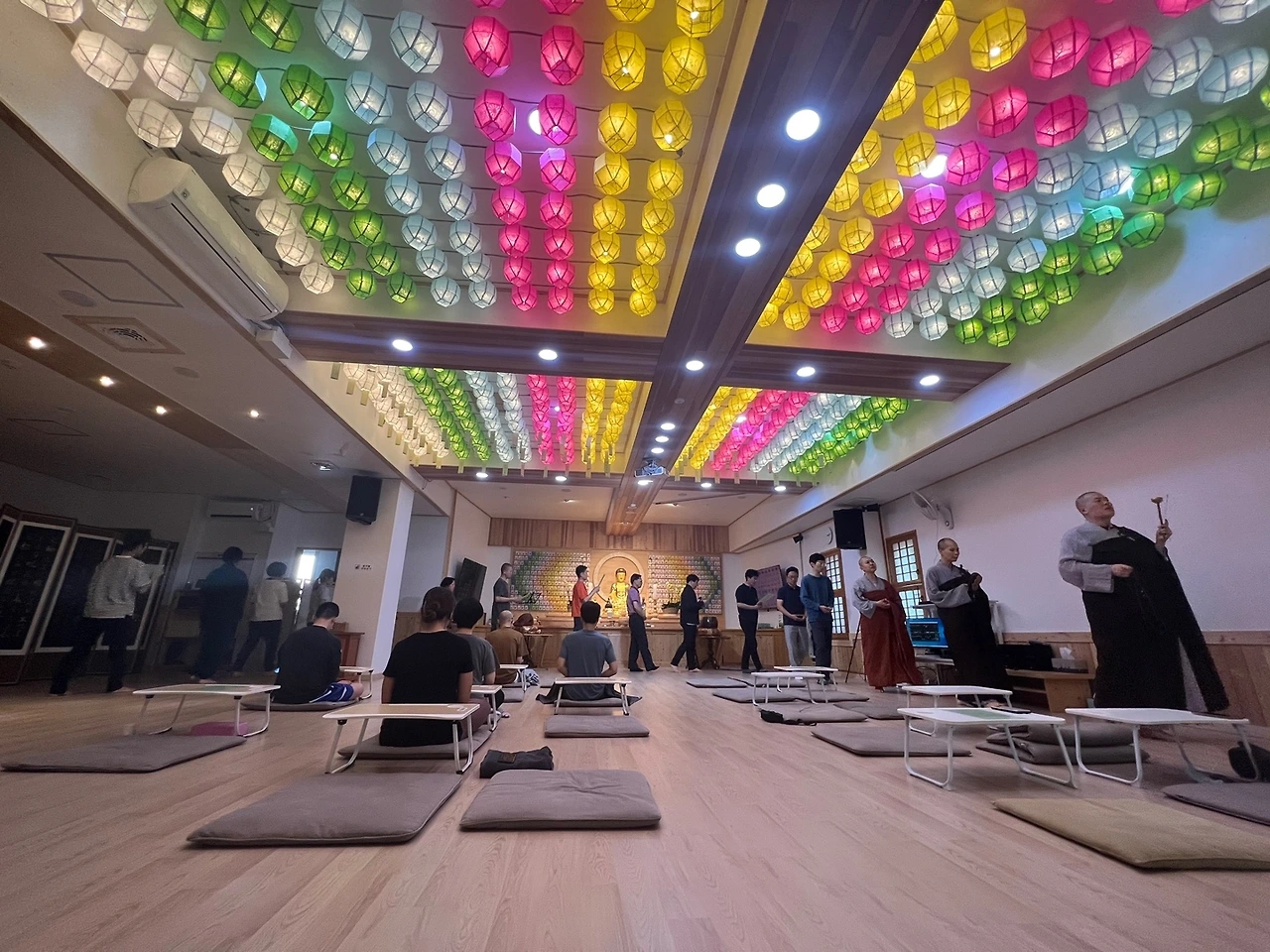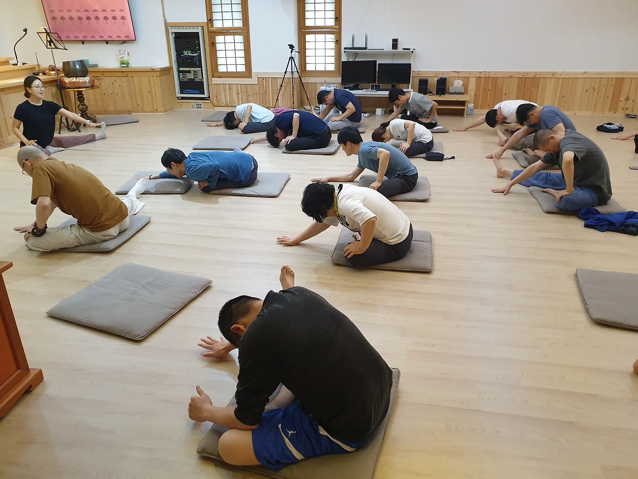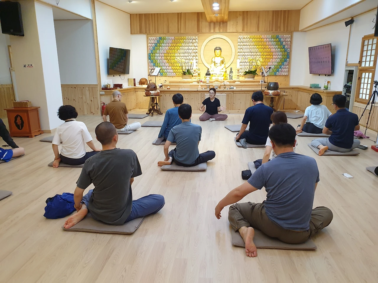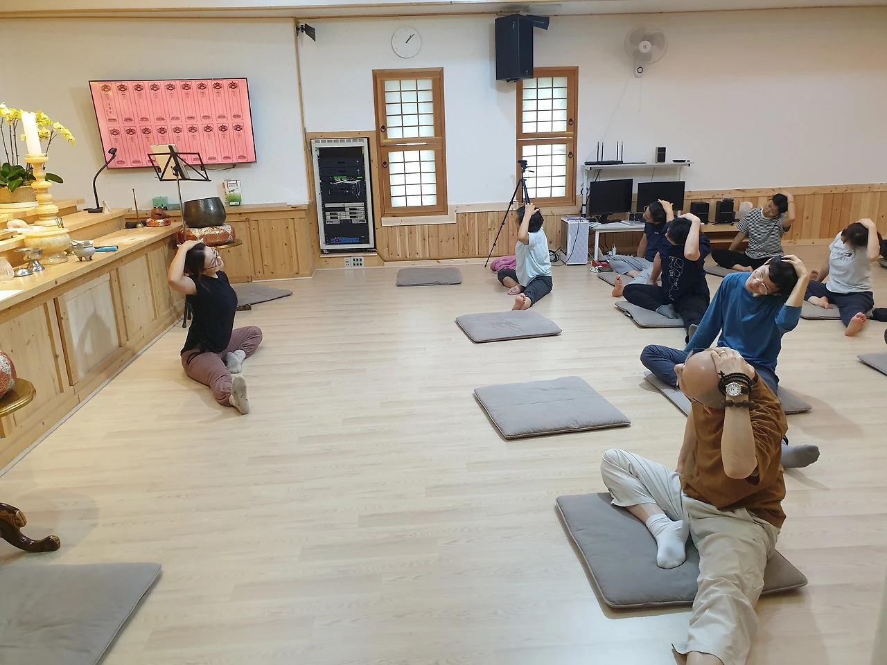 그리고 나머지 진언수행은 앉아서 합니다... 오늘 신기하게도 참여자 중 남자 12명, 여자 6명이란 남자가 압도적으로 숫자가 많은 성비를 보였습니다. 요즘 절에 남자가 별로 없다던데, 요가쎔을 초대한 덕분일까요? 아무튼 요즘 보라선원에는 점점 더 많은 남자분들이 수행에 동참하러 오고 계십니다. 남녀노소 모두 모여서 함께 수행하니까 절 분위기가 점점 더 활기차집니다.