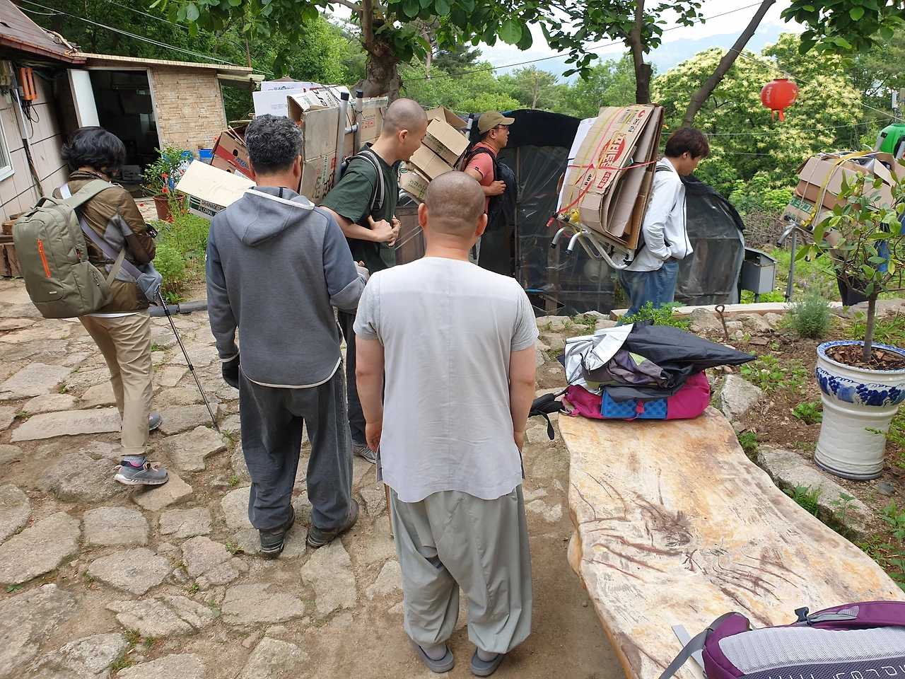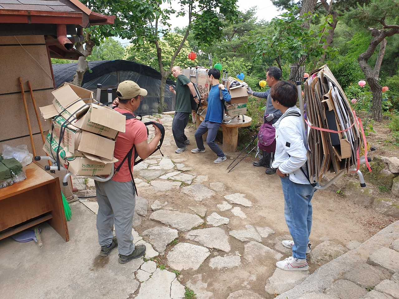 재활용 박스들고 하산하는 청년들...