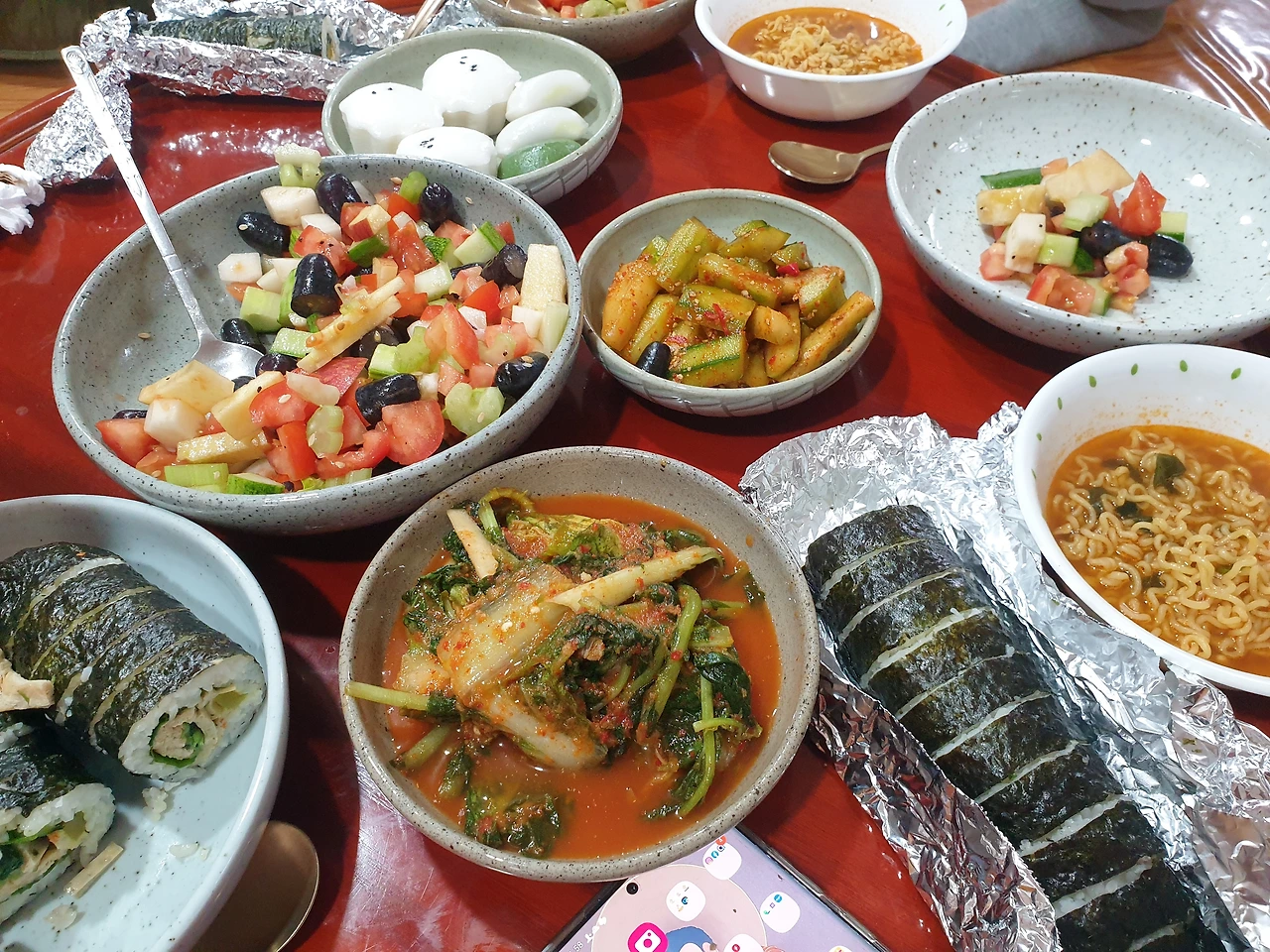 보라선원에서 싸온 김밥과 라면