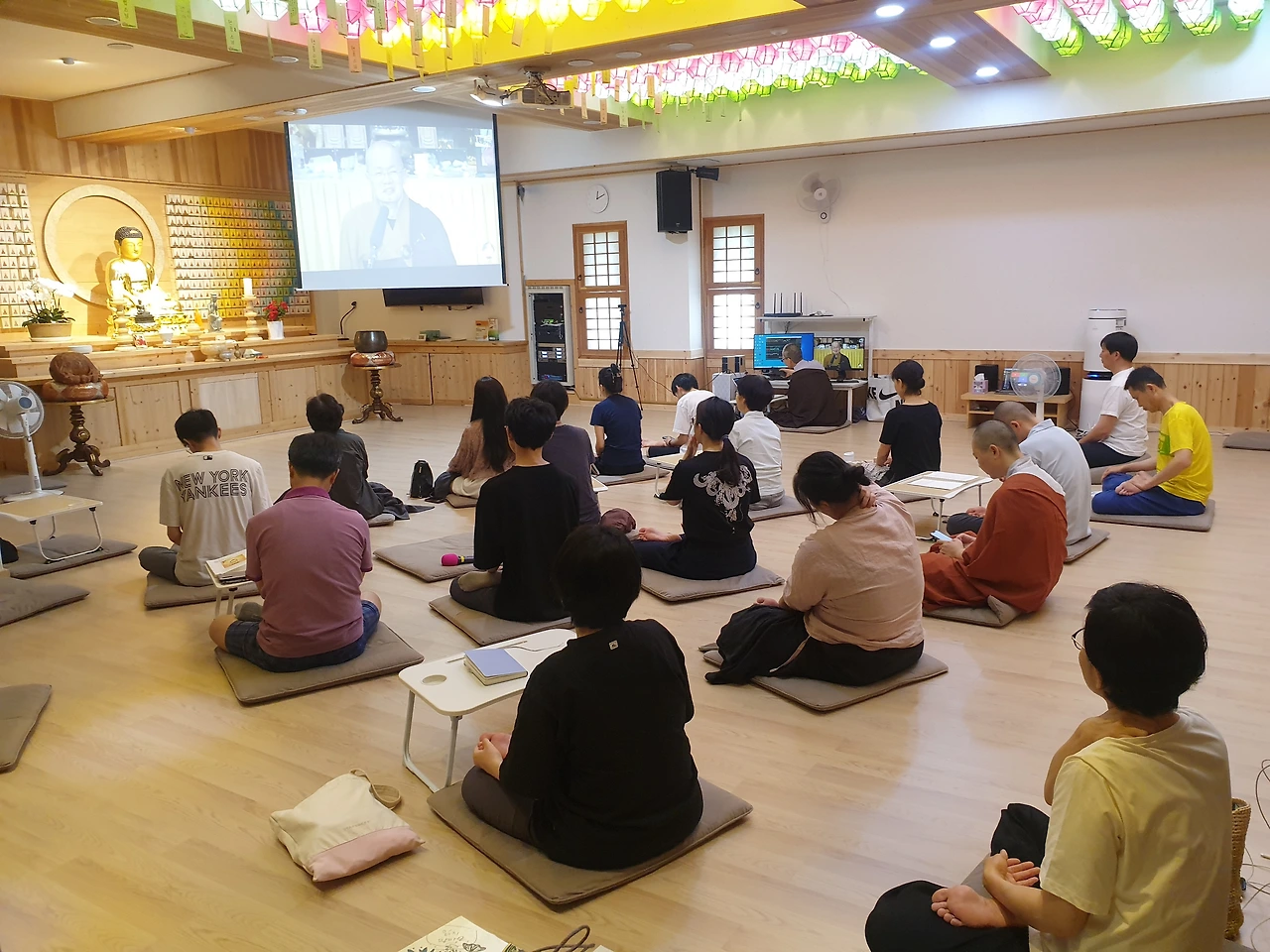 아직도 여름 안거(선칠)을 진행 중입니다. 그래서 점심 식사 후 실시간 화상회의 시스템으로 미국 도량과 한국 도량은 다같이 영화 스님의 불경 강설을 듣습니다.