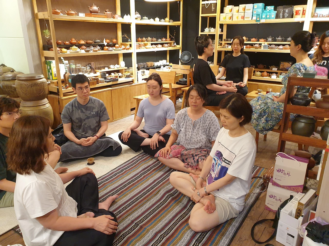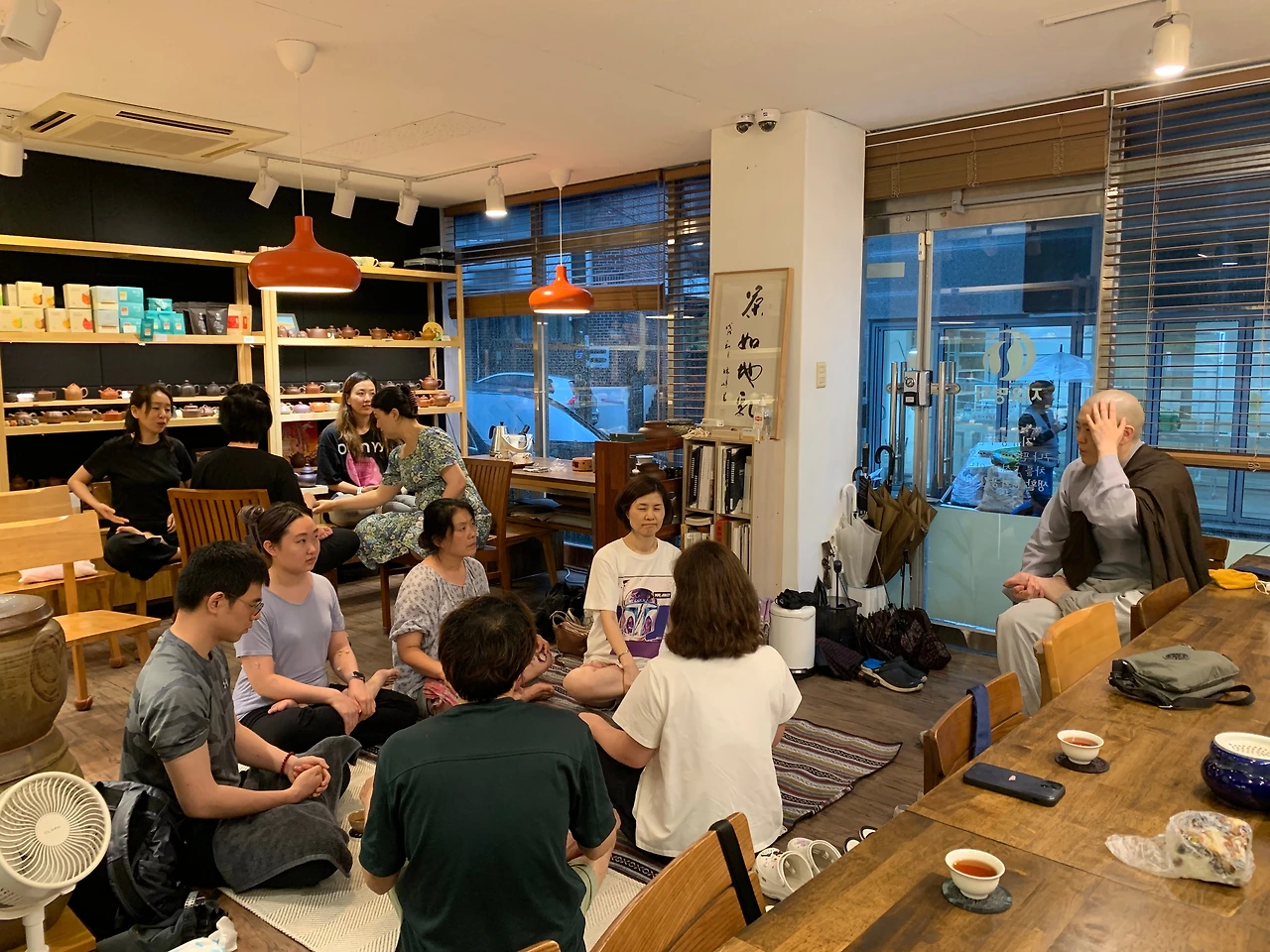 의자 위에서도 결가부좌! 명상 후 질의응답 시간도 있었고, 끼리끼리 모여서 즐거운 시간을 보냈어요. 점장님이 아끼지 않고 맛있는 보이차도 팍팍 풀어주셨어요. 명상에 관심이 있다면 신청 하지 않으셨어도 그냥 오실 수 있습니다. 어떻게든 공간을 마련해서 같이 하면 되니까요 .