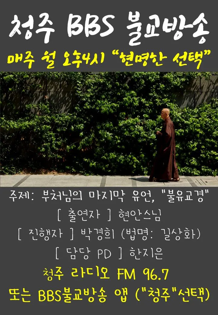 참고로 저는 청주BBS불교방송에서 매주 월요일 오후4시 라디오 방송을 합니다. 8월 7일부터 매주 월요일 영화 선사의 불유교경에 관한 내용으로 방송을 진행할 예정입니다. 이 방송은 청주 및 근교지역 라디오 주파수 FM 96.7 또는 BBS불교방송 앱(해당지역 청주 선택)으로 들을 수 있습니다.