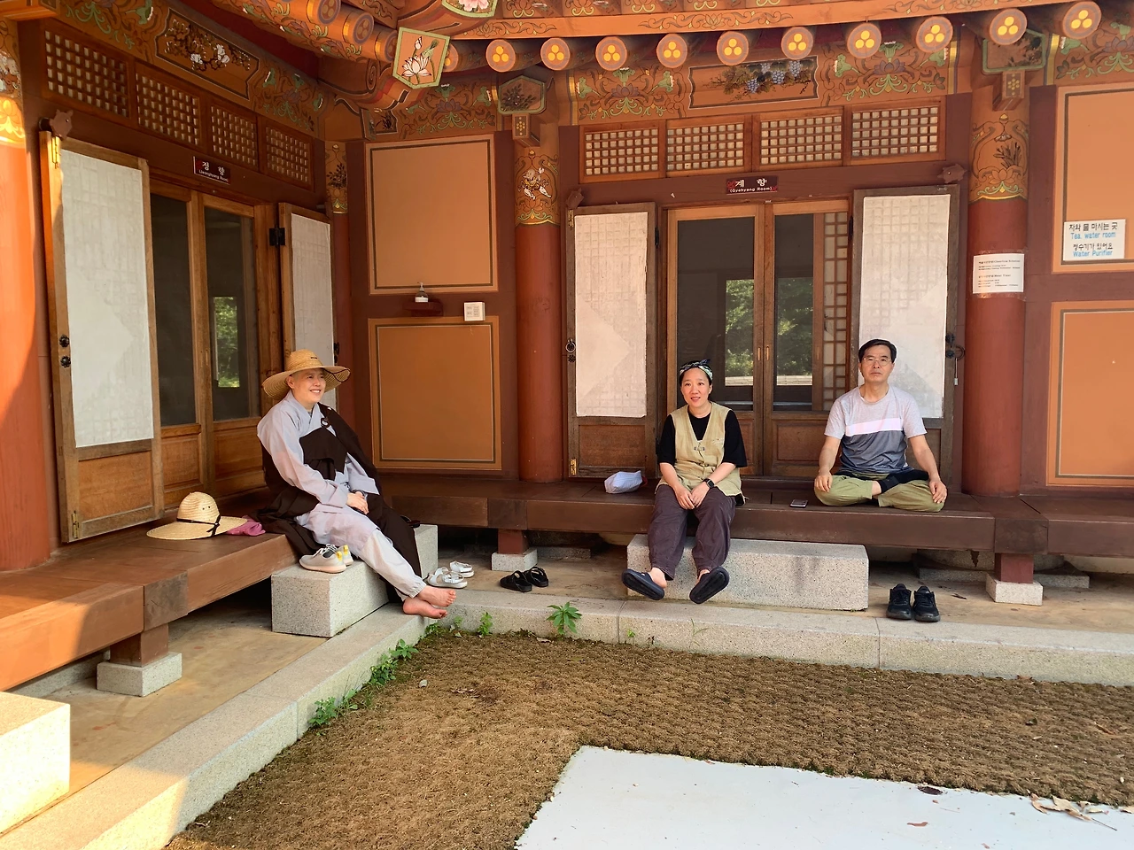 산에서 내려와 보니 템플 원장스님이 나와 계셨는데, 정해진 일정은 아니였지만, 하나 둘씩 모여서 차를 마시기 시작했어요. 스님이 법주사에 대해서 자세히 설명해주셨고, 그러다 보니 모두 다 모이게 되었어요.