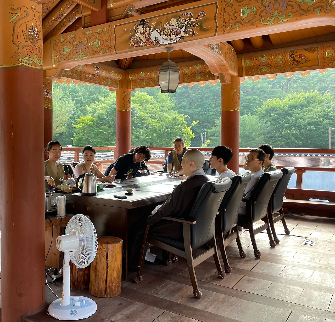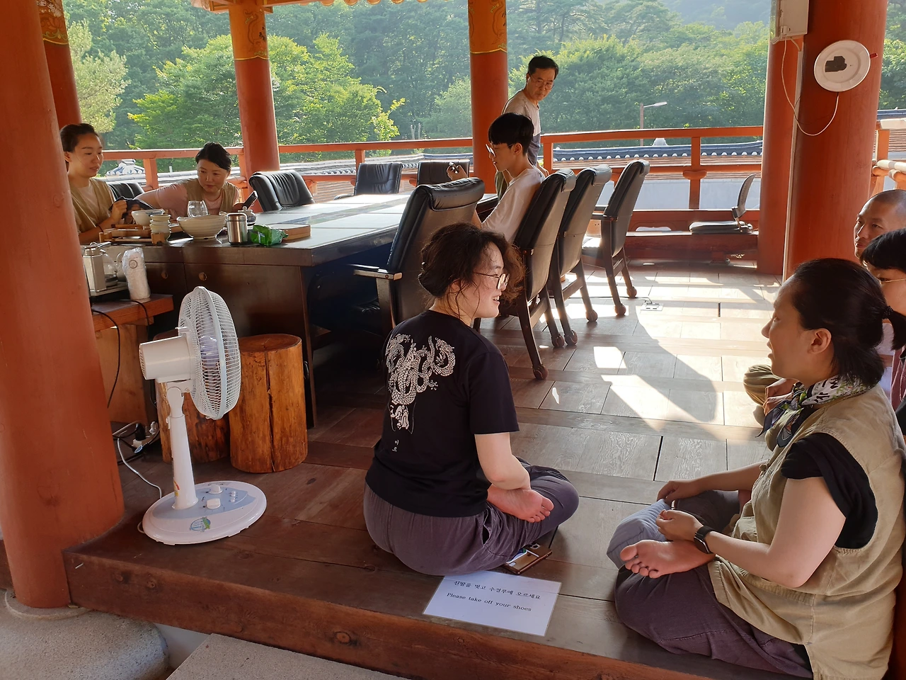 템플스테이관에 차 마시는 곳이 있는데, 너무 멋졌어요. 보라선원은 상가 건물 안에 있어서 운동량도 부족하고 공기도 안통해서 에어컨으로 환기하는데, 이렇게 산 속에 있으니 너무 행복했습니다. 학생들에게 교통 좋은 곳에서 수행할 수 있게 해주는 보라선원이지만, 이런 공기좋고 탁트인 환경은 아니여서 아쉬운데, 이렇게 한번 다같이 나들이해서 다행이에요.