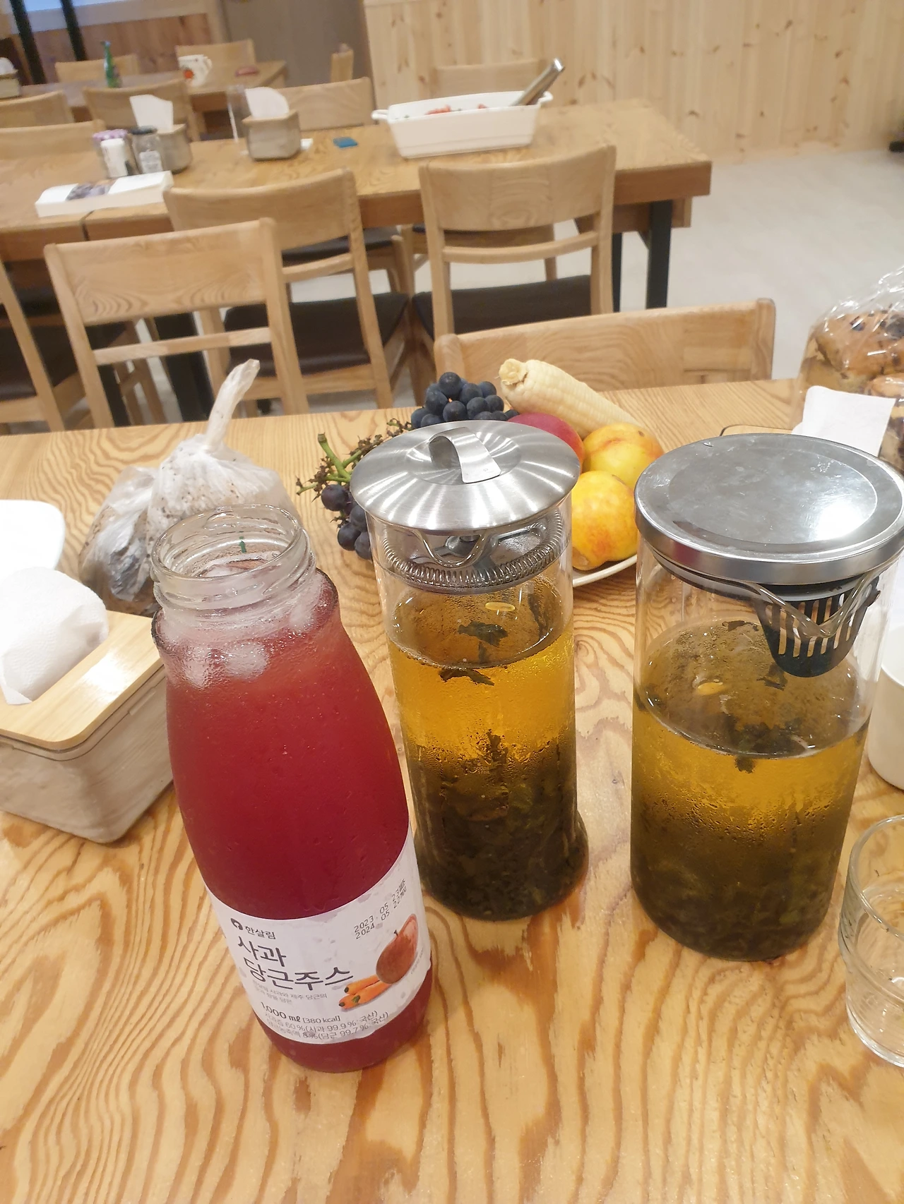 그러더니 이렇게 냉우롱차, 오미자아이스티를 준비했어요.