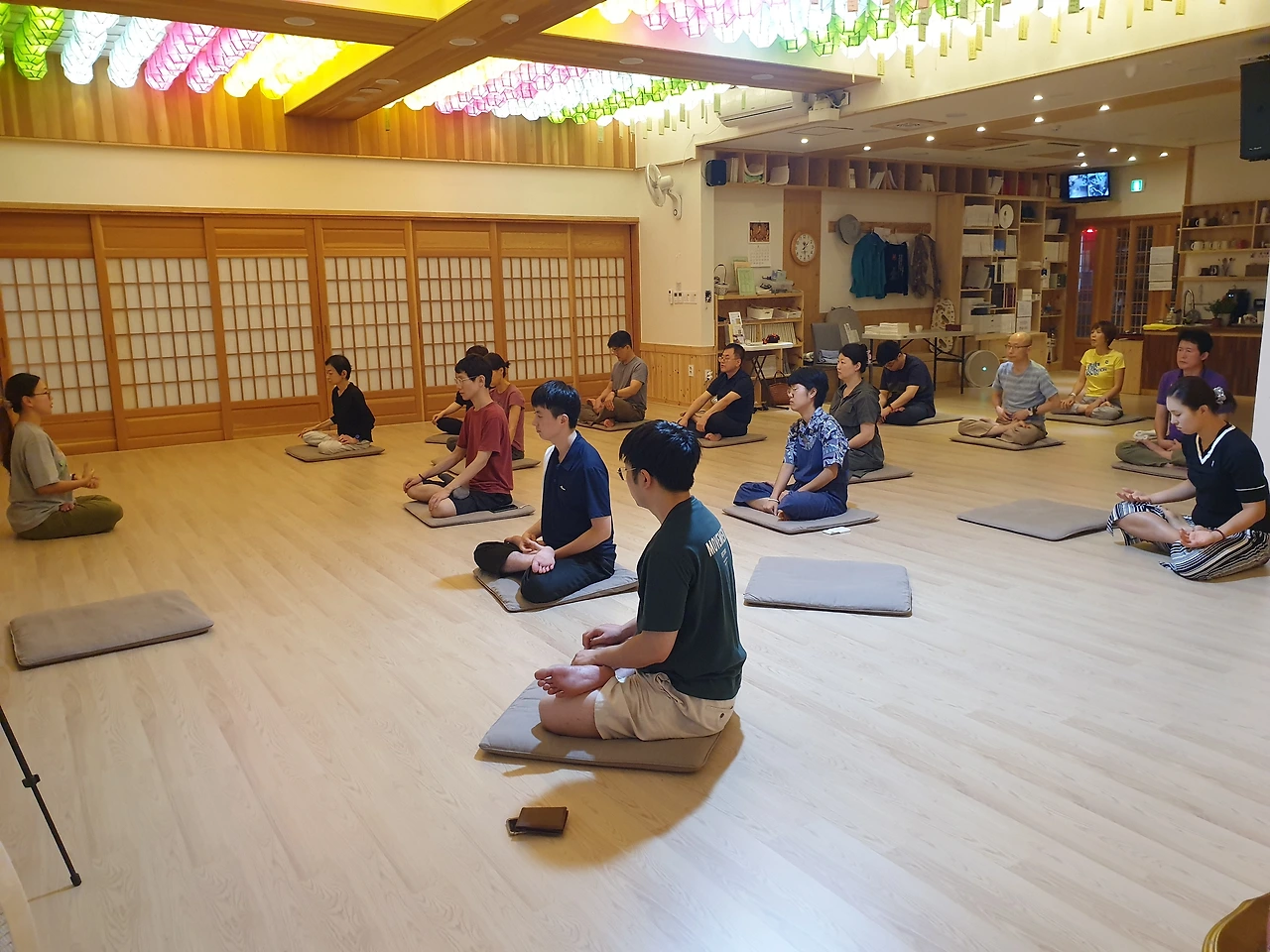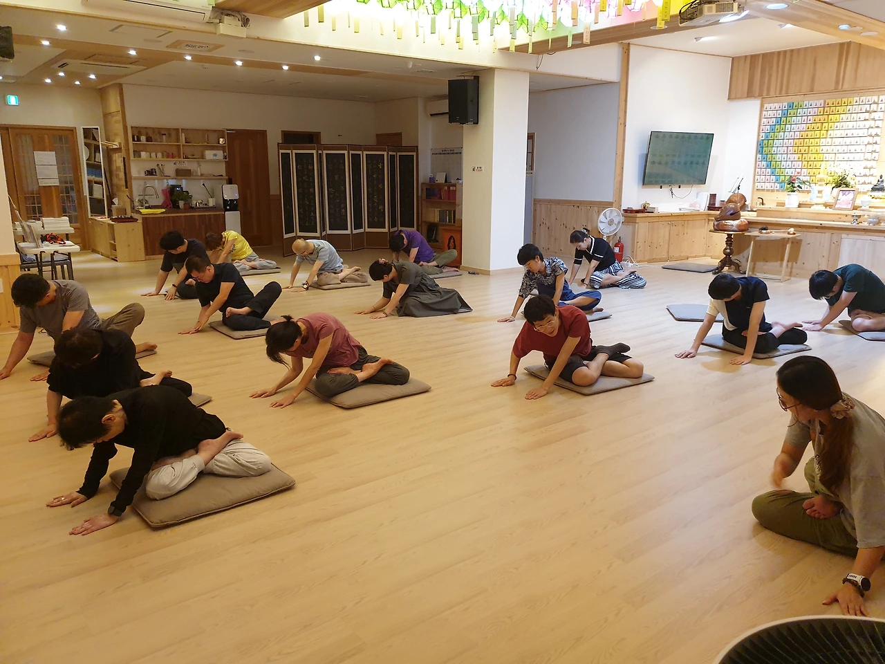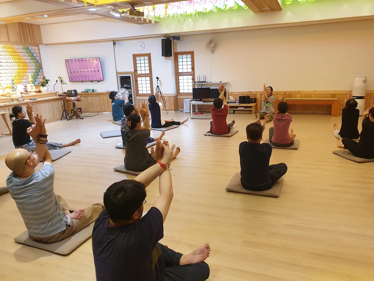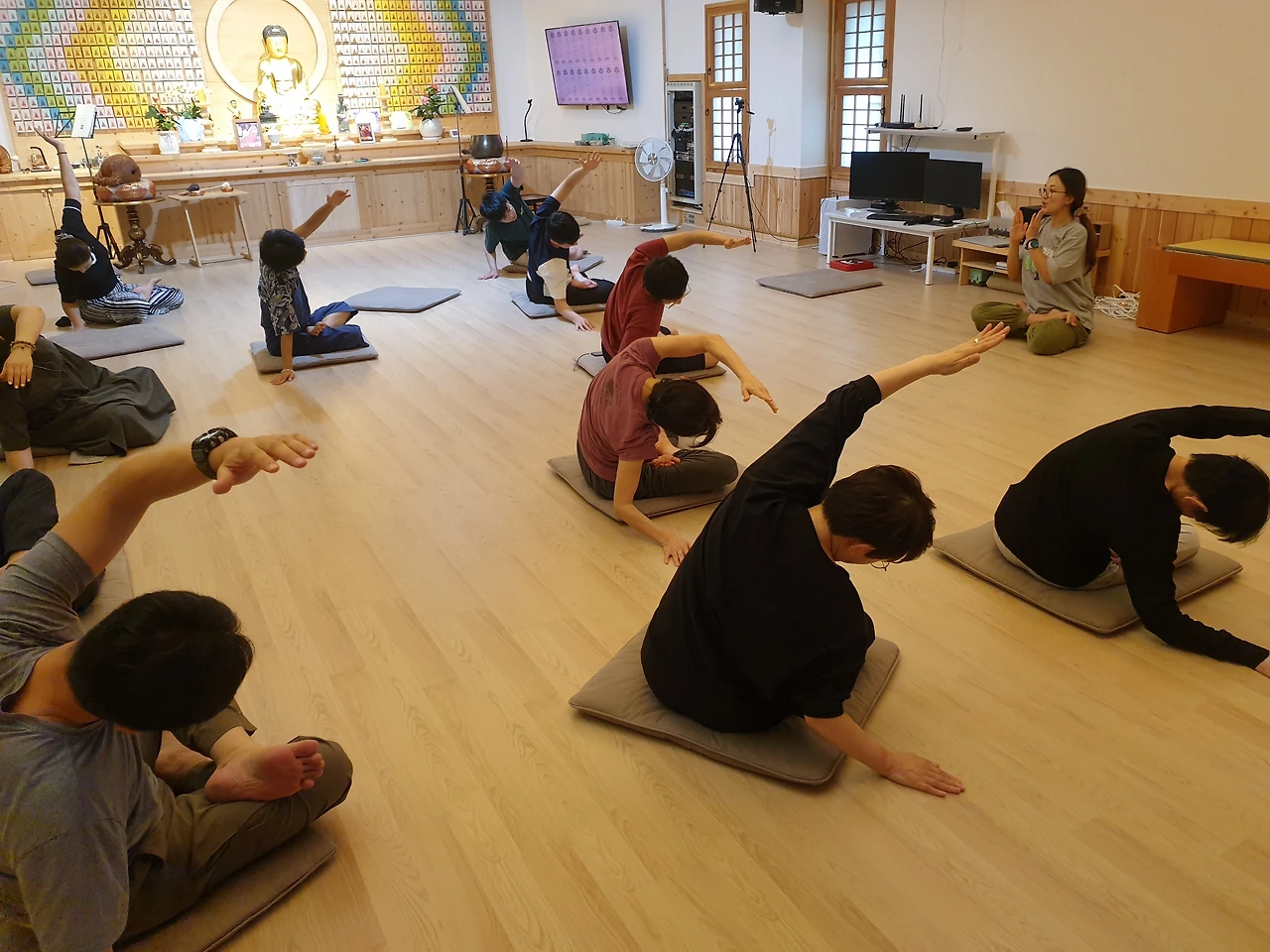 오후 1시에는 정혜윤 요가쌤의 재능기부로 사람들이 몸을 풉니다. 명상하기 전에 이렇게 스트레칭을 하니까 다들 좋다고 했습니다.