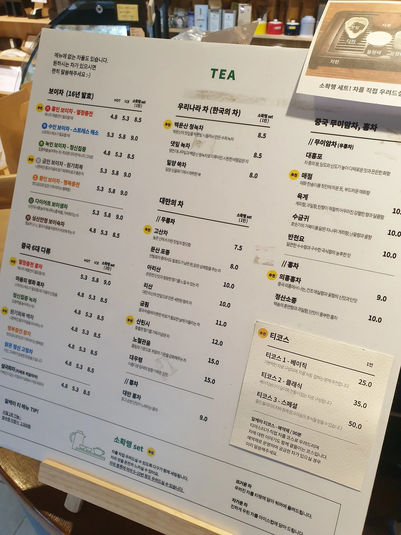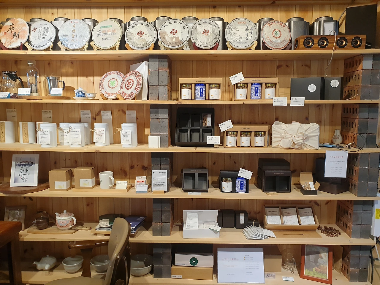 여러 가지 다도 도구와 차를 살 수 있어요. 다양한 메뉴가 있어요. 밀크티는 한국에서 마셔본 곳 중에 여기가 최고랍니다. 다기와 보이차, 우롱차, 생강차... 많이 준비되어 있습니다.