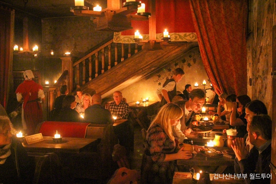 실내로 들어서면 촛불 외에 다른 조명이 없어 어두운 분위기가 느껴진다. 직원의 안내를 받아 메인 홀에 들어서니 영화에서 보던 멋진 중세 여인숙 식당에 들어선 것 같았다. 나무로 된 테이블과 의자, 오래되어 보이는 벽화들, 복잡한 내부 구조와 어두운 분위기 속에 중세 복장을 한 직원들을 보고 있으면 정말 중세에 온듯한 착각이 들었다.