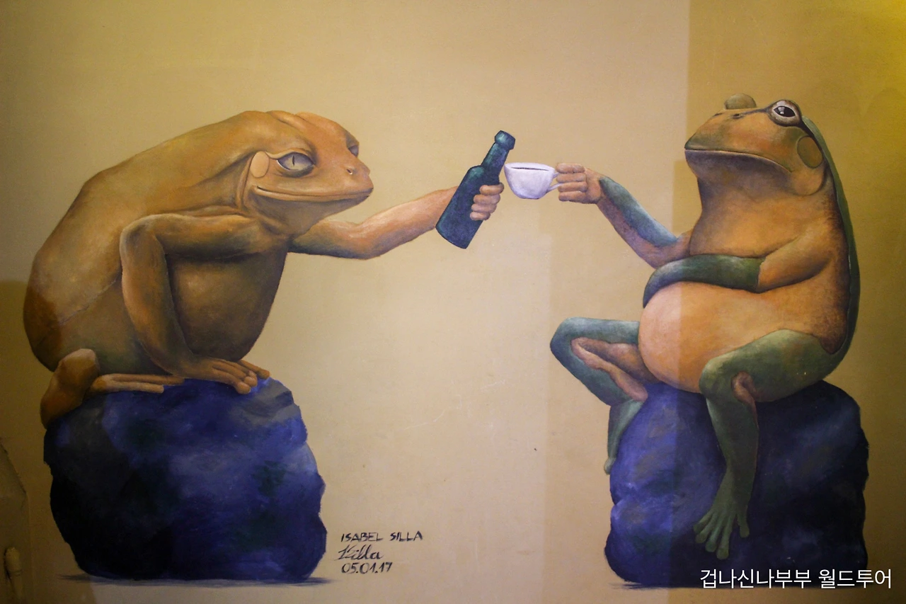 가게에 들어서면 벽면에 그려져 있는 센스 넘치는 개구리 벽화들이 인상적이다. 맥주와 커피를 건배하는 두 개구리와 새똥을 맞고도 평상심을 유지하며 요가하는 개구리. 멋들어진 명품 시계를 찬 벌거벗은 개구리까지 모두 동일한 사람의 작품이다.