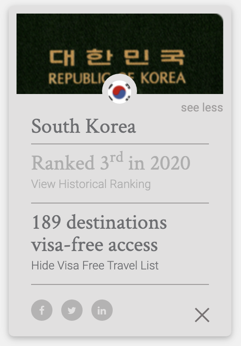 매년 영국의 '핸리 앤드 파트너스'사에서 전 세계 여권 파워 랭킹을 발표한다. 이 랭킹은 사전 비자 발급 없이 여권만으로 방문할 수 있는 나라의 수로 순위를 매기는데, 2020년 우리나라는 일본, 싱가포르 다음으로 3위에 올랐다. 1등 일본 191개, 2등 싱가포르 190개에 비해 딱 한, 두 나라가 부족한 189개의 나라를 대한민국 여권이 있으면 입국이 가능하다.