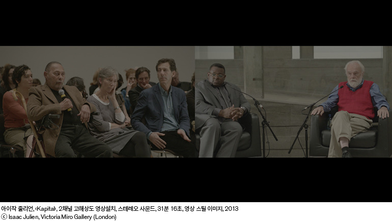 1부에서 숨 가쁘게 돌아가는 자본의 현장으로 우리를 이끌어 갔다면, 2부에서는 보다 작은 두 개의 스크린 앞으로 바짝 다가앉게 함으로써 자본이라는 주제의 담론으로 우리를 이끌어 동참하게 한다. 세계적인 명성의 데이비드 하비의 등장으로 ‘자본은 왜 포착되기 어려운가?’라는 질문과 함께 시작하는 자본에 대한 담론을 눈앞에서 보는 듯한 착각이 들게 하는데 바로 아이작 줄리언의 두 번째 작품인 KAPITAL이다.
