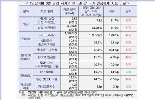 ‘1인당 소득 3만 달러 시기 G7국가 평균과 한국 민생지표’를 비교 분석한 현대경제연구원은 1인당 국민총소득(GNI) 3만 달러 시대를 눈앞에 둔 우리 국민들이 과거 비슷한 시기의 선진국(G7ㆍ선진 7개국)보다 임금은 20% 가량 덜 받으면서 일하는 시간은 20% 더 길다는 분석 결과를 내놓았다. 우리나라는 빈곤율이나 사회복지지출 수준도 선진국보다 크게 뒤처져 있어, 앞으로 경제성장이 삶의 질 향상으로 이어질 수 있는 성장모델이 필요하다고 지적하고 있다(한국일보, 2017.07.16).