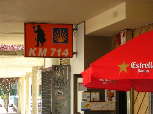 뜨거운 햇살아래 거리는 조용하기만 하다. 앙증맞은 순례자 표식을 걸어놓은 어느 빠의 모습.