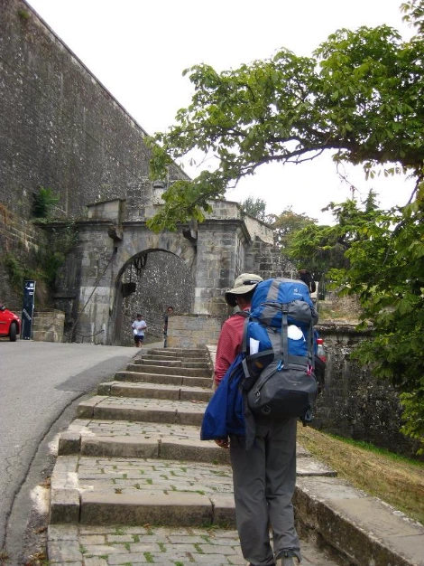 팜플로나에 도착했음을 가장먼저 알리는 것은바로 길아래 바닥의 맨홀뚜겅! 드디어 오늘 목적지의 끝인가. 뒷모습조차도 힘들어 보이는 이 시점에 아 반갑고 반갑다!!마치 요새같은 거대한 성곽문을 통과하니 쨘~하고 고대도시 팜플로나가 나타난다.