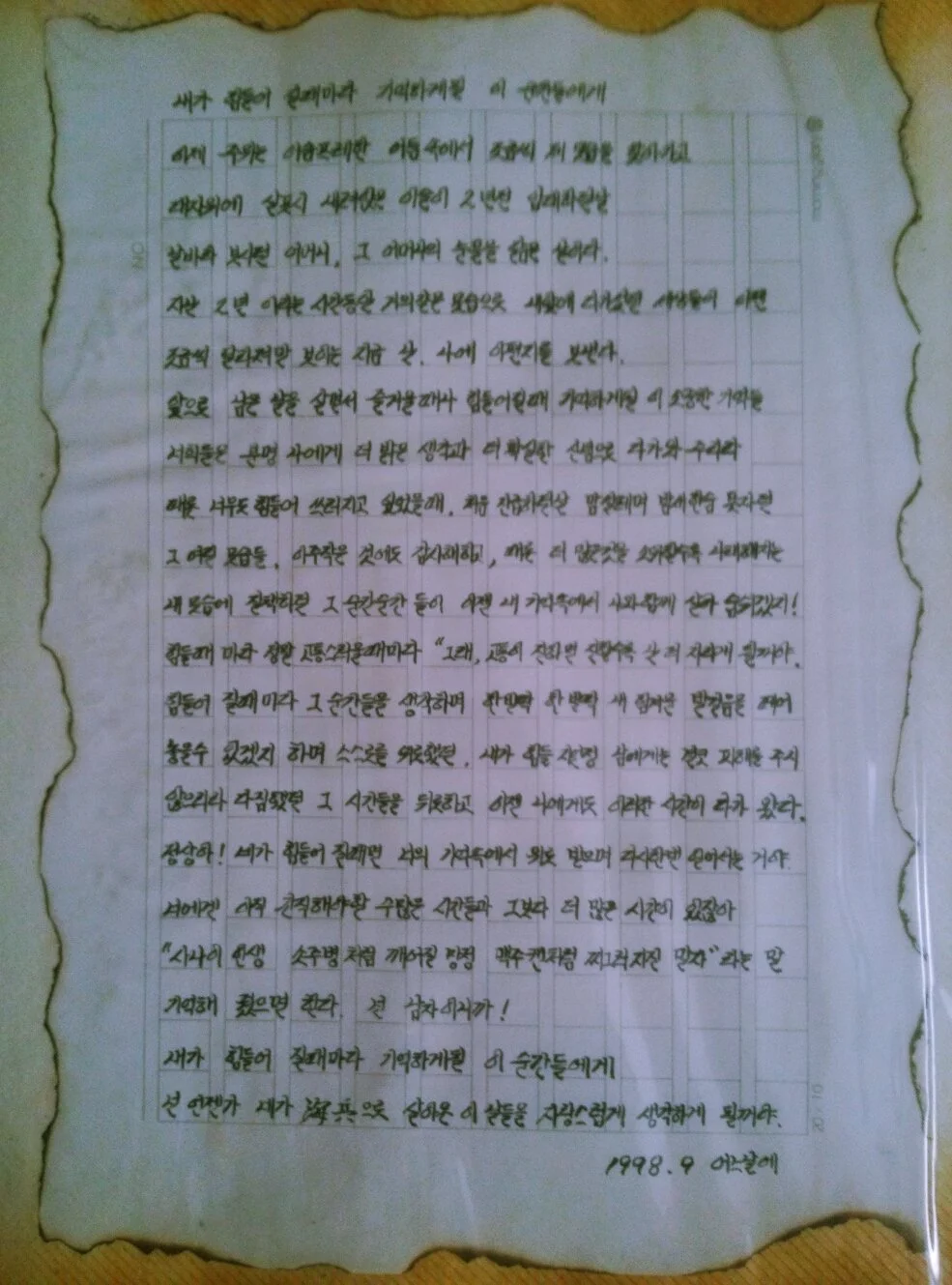 -내가 힘들어 질때마다 기억하게될 이 순간들에게...이제 주위는 어슴프레한 어둠 속에서 조금씩 제 모습을 찾아가고, 대지 위에 내려 앉은 이슬이 2년전 입대하던 날 날바라보시던 어머니! 그 어머니의 눈물을 닮은 날이다. 지난 2년이라는 시간동안 거의 같은 모습으로 내 앞에 다가섰던 이 세상들이 이젠 조금씩 달라져만 보이는 지금, 난 나에게 이 편지를 보낸다. 앞으로 남은 날들을 살면서 즐거울때나 힘들어질때 기억하게될 이 소중한 기억들... 너희들은 분명 나에게 더 밝은 생각과 더 확실한 신념으로 다가와 주리라. 때론 너무 힘들어 쓰러지고 싶었을 때, 처음 진급하던 날 맘설레며 밤새 한숨 못자던 그 여린 모습들, 아주 작은것에도 감사하고 때론 더 많은것을 소유 할수록 더 나태해지는 내 모습에 질책하던 그 순간순간들이 이젠 내 기억속에서 나와함께 살아 숨쉬겠지! 힘이 들때마다 정말 고통스러울 때마다 "그래 고통이 진하면 진할수록 난 더 자라게 될꺼야" 힘들어 질때마다 그 순간들을 생각하며 한발짝 한발짝 내 힘겨운 발걸음을 떼어 놓을 수 있겠지! 하면서 스스로를 위로했던, 그리고 내가 힘이 들지언정 남에게는 결코 피해를 주지 않으리라 다짐했던! 그 시간들을 뒤로하고 이젠 나에게도 이러한 시간이 다가왔다. 그래 정상아! 네가 힘들어 질때면 너는 너의 그 기억속에서 위로 받으면서 다시한번 더 일어서는거야! 너에겐 아직 간직해야할 수많은 시간들과 그보다 더 많은 시간들이 있잖아? "사나이 인생 소주병처럼 깨어질 망정 맥주캔처럼 찌그러지진 말자"라는 말을 기억해줬으면 한다. 넌 남자이니까! 내가 힘들어 질때마다 기억하게될 이 순간들에게, 넌 언젠가 네가 해병으로 살아온 이 날들을 자랑스럽게 생각하게 될꺼야. 1998. 9 어느날에~