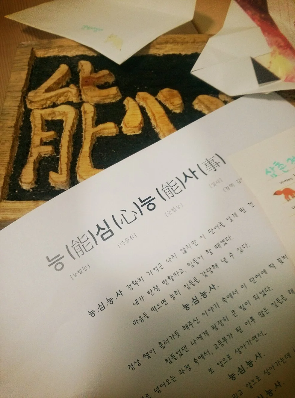 어느날 주여 시간에 쌤이 저한테 와서 "힘들다" 고 이야기 했고. 그 말을 듣는 순간 '능.심.능.사' 이 말이 생각이나서 그날부터 나무에 글을 새겨 당신께 줄 작품을 만들었습니다.