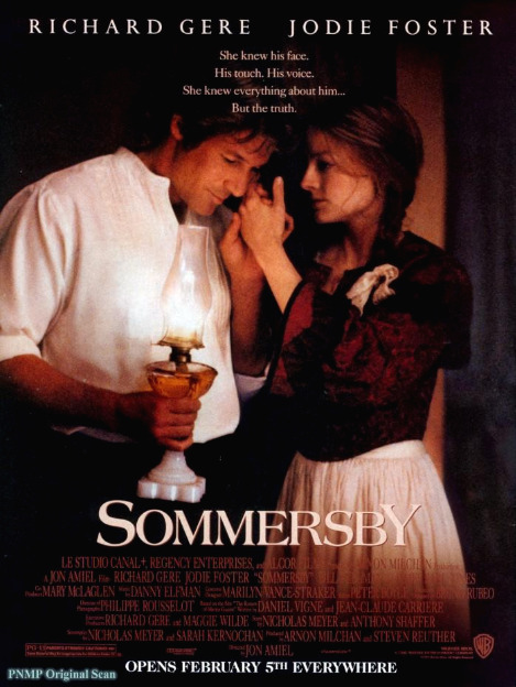 영화는 남북 전쟁이 막 끝난 시점의 미국을 배경으로, 한 남자가 어떤 시신 위로 돌무덤을 쌓는 장면으로 시작한다. 그 남자는 며칠에 걸쳐 먼 길을 걸어 어느 한 마을에 당도한다. 황무지가 된 땅을 성의 없이 갈고 있던 어떤 사람에게 아는 체를 하는 그 남자. 땅을 갈던 사람은 한참을 보더니 깜짝 놀라면서 그를 반긴다. 그리고 주위에 이렇게 소리친다. 잭 써머스비가 돌아왔어! 영화의 주인공 잭 써머스비는 포도 농장의 주인이었지만 남북 전쟁의 발발과 더불어 남군으로 참여했다 6년 만에 이렇게 고향으로 돌아오게 된다. 흑인 시동이 급하게 큰 저택 쪽으로 달려간다. 저택 주변 밭에서는 남자와 여자 둘이서 땅을 갈고 있다. 시동이 잭 써머스비의 귀환을 알렸을 때, 함께 밭을 갈던 남자는 떨떠름한 표정을 지었고 여자는 서둘러 저택으로 달려간다. 저택 정문 앞에 앉아서 놀고 있던 아이를 일으켜 끌며 아빠가 돌아왔다고 말하곤 다급하게 집 안으로 들어간다. 저 멀리서 마을 사람들이 떠들썩하게 잭 써머스비를 데리고 집으로 오고 있었고 아내 로렐은 대충 옷매무새를 정리하고 그를 맞이하러 저택 바깥으로 나왔다. 6년 만의 재회... 하지만 아내의 표정이 그리 밝지만은 않다. 흔히 그러듯 전쟁 나간 남편의 생사도 모른 채 마냥 기다리는 여자와 그런 여자를 흠모하는 이웃 남자. 그 남자는 여자에게 모든 정성을 다해 친절을 베풀었고 여자는 조금씩 마음이 흔들렸을 것이리라. 6년의 기다림에 지친 여자는 친절하고 자상한 이웃 남자에게 일 년 후에도 남편이 돌아오지 않는다면 그와 결혼하기로 약속한 터였다. 하지만 남편은 돌아왔고 로렐을 도와 같이 밭을 갈던 이웃 남자 오린 미첨(빌 풀먼 분)의 표정은 당연히 좋을 수는 없었을 것이리라.