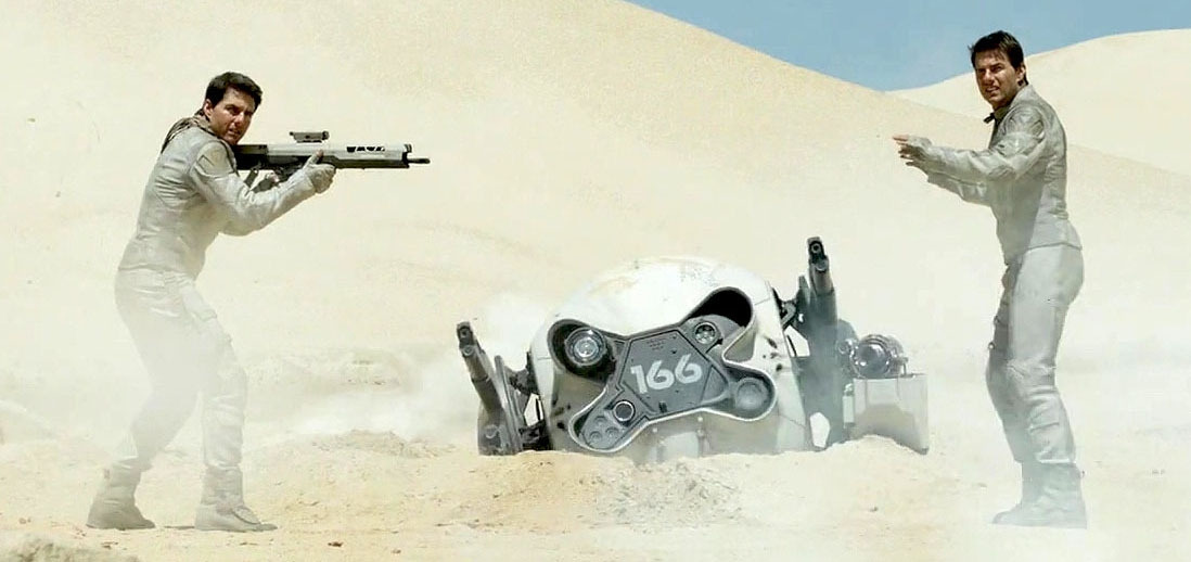 여기까지가 영화 <오블리비언>에 대한 줄거리다. 영화가 주는 메시지든, 아니면 행간의 의미든 따지지 않더라도, 굳이 뭐라도 건져내고자 하는 노력 없이 그냥 영화 그 자체로 가볍게 보더라도 이 영화는 재미있다. 비록 크게 흥행은 못했지만 탄탄한 스토리와 연출, 준수한 SF적 영상미와 괜찮은 사운드 트랙을 갖추고 있는 수작이다. 하지만 이 영화는, 비록 어떤 심오한 이야기에 깊이 천착하고자 하는 그런 류의 영화는 아닐 지라도 연작의 주제인 "복제인간"이라는 관점에서 들여다본다면 앞서 소개했던 두 편과는 또 다른 시선으로 복제인간을 바라볼 수 있는 여지를 제공한다. 앞서 소개했던 <6번째 날>과 <더 문>의 경우와 마찬가지로 이 영화에서도 클론의 정체성에 대한 질문을 던질 수 있다. 두 동일 인물이 서로 대면하는 구조는 앞서의 두 영화와 비슷하지만 대면의 구성에는 차이가 있다. <6번째 날>에서는 원본과 클론이 직접 대면하게 되면서 서로 티격태격하는 과정에서 서로를 인정하게 된다. 사실 <6번째 날>은 버디 무비 형식을 띠는데 이때 콤비로 활약하며 사건을 해결하는 두 주인공은 바로 원본과 클론이다. 이렇게 버디 무비라고 할 수 있는 전제는 결국 원본과 클론이라는 관계를 넘어서는 상호 인정일 것이다. <더 문>의 경우 <6번째 날>과 마찬가지로 두 명의 동일 인물 사이의 상호 인정 과정을 그리고 있지만 그 둘은 원본과 클론으로 구성된 <6번째 날>과 다르게 원본의 존재와는 상관없는 클론 vs 클론으로 구성된다. 원본의 부재 속에서 두 클론은 정체성의 문제로 극한의 대립까지 치닫지만 이 대립을 넘어선 두 클론은 결국 서로를 위해 희생하고자 하는 이타적 행위에까지 다다른다. 더 나아가서 영화는 이러한 이타성으로 이어지게 하는 또 다른 조력자로서 AI를 내세우는데 종국에는 이 AI마저 이타성을 담지한 존재로 그리면서 인간 정의의 범위를 확대시킨다. 이런 차이에도 불구하고 두 영화는 두 동일 인물의 갈등을 통해 서로의 차이를 인정하게 되고 그 과정을 거치면서 정체성의 문제를 종국에는 자연스럽게 인간다움에 대한 정의로 귀결시킨다고 볼 수 있다. 어찌 되었든 두 영화 모두 정체성의 문제에 있어서 두 명의 동일 인물의 원본 욕망에 따른 갈등을 거쳐 종국에는 원본과 무관하게 서로의 정체성을 확립하고 인정하게 된다.