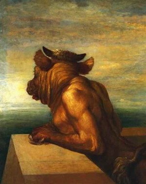 신화 속에서 언제나 무시무시한 괴물로 등장하는 미노타우로스. 하지만 보르헤스의 이 단편에서는 소외와 배제라는 절대 고독 속에서 말 그대로 가련한 주인공으로 등장한다. 그리고 그 결말은 비극이다. 물론 비극이란 의미는 읽는 독자의 편에서, 그리고 전통적인 희/비극의 구분에 따라서 비극이겠지만 가련한 주인공으로서의 미노타우로스에게는 해피 엔드일 것이다. <아스테리온의 집>을 다 읽고 나서 그 기나긴 외로움 속에서 홀로 그 긴 시간을 버텨 왔을 미노타우로스의 이미지를 머리 속에 그려 보았다. 하지만 쉽게 그려지지 않은 채 그 가련한 주인공의 절대 고독이 계속 나의 머리 속에서 맴돌았다. 그러다 그 가련한 주인공의 성격은 왓츠(Watts)가 그린 한 화폭에서 영감을 얻었다는 보르헤스의 언급을 <알렙>의 후기에서 읽게 되었고 그 그림은 마침 민음사 판의 <오비디우스의 변신 이야기, 이윤기 옮김, 민음사, p340> 제 1권에 나온다. 1885년에 영국의 화가이자 조각가인 George Frederic Watts가 그린 “The Minotur”란 작품이다. 위의 그림이 그것이다. 황소의 머리를 한 인간, 자신을 가둔 미로의 꼭대기에서 지는 노을을 향해 멍하니 던지는 시선, 눈은 보이지 않지만 그 향하는 시선을 따라 묻어나는 외로움, 고독... 왓츠의 이 그림 속에서 보르헤스가 느꼈을 만한 그 가련함이 조금이나마 내게 느껴지는 듯했다.
