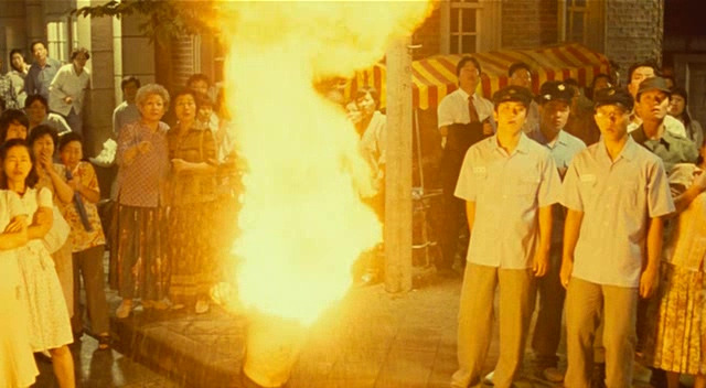 필자의 경우도 군사정권 말기에 대학 시절을 보냈기에 어느 정도 공감은 갔지만 70년대 말 대학 캠퍼스의 모습은 영화에 나온 대로, 필자가 감히 입에 올린 공감이란 표현이 죄스러울 정도로 훨씬 더 참혹했다. 당시는 사복 경찰들이 캠퍼스 내에 상주하면서 학생들이 서, 너 명만 모여도 덮쳐서 연행해 가던 시기였다. 모여 구호를 외치는 것 자체를 아예 원천 봉쇄하기 위함이었다. 그렇기에 학생들은 중앙 도서관이나 학생회관 옥상에서 몸에 밧줄을 감아 매달린 채로 아래로 내려오면서 구호를 외치거나 이 영화에서처럼 그렇게 옥상에서 구호를 외치며 유인물을 뿌린 후 투신하거나 심지어 분신까지 감행했었다. 당시는 오후 다섯 시가 되면 국기 하강식이 거행되면서 전국 거리 곳곳에 애국가와 "국기에 대한 맹세"가 울려 퍼졌고 사람들은 모두 하던 일을 멈추고 내려가는 태극기를 향해 가슴에 손을 올리고 있어야만 했었다. 물론, 그렇게 하지 않는다면 연행되던 암울한 시기였고 영화는 그런 상황을 그대로 묘사하고 있다. 트라우마로 각인될 만한 그런 충격을 그에게 고스란히 선사하고 수수께끼만 남긴 채 가버린 삐삐소녀... 자취방에 돌아온 수영은 그 충격에서 헤어나지 못했고 함께 찍어 냈던 유인물을 갈기갈기 찢어버린 채 깡소주 몇 병을 병나발 채로 들이키다 기어이 쓰러지고 만다.