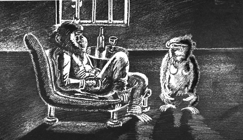 이런 탈출은 인간이 머리로 하는 계산이다. 하지만 배(腹)로 생각하는 페터는 계산이 아니라 관찰을 했다. 그가 보기에는 중갑판에 모이는 여러 사람들은 얼굴도, 소리도 구분하기 힘들었고 그저 희미한 하나로만 보였다. 그리고 그에게 목표가 떠올랐다. 구분도 어려운 그들의 일부가 된다면... 물론 그들처럼 된다 하더라도 잠긴 우리의 문이 열릴 거란 약속은 없었지만 그것의 실현은 예전에 헛되이 추구되었던 바로 그곳에 나타나는 법이다. 그가 자유의 신봉자였다면 대양을 택했겠지만 그는 사람들의 흐릿한 눈길 속에 비치는 출구를 찾았고 그것을 끊질기게 관찰했다. 그리고 그 관찰이 비로소 그를 특정 방향으로 밀어 넣었다. 사람들을 흉내 내는 일은 처음에는 쉬웠다. 침 뱉는 것은 금방 따라 했고 머지않아 그는 영감처럼 파이프 담배를 피울 수도 있었다. 물론 흉내내기였기 때문에 담배가 채워진 파이프와 빈 파이프를 구분할 수는 없었지만 그가 엄지 손가락을 파이프 구멍에 대고 꾹꾹 눌러댔을 때에는 중갑판 전체가 환호성으로 가득 찼다고 했다. 하지만 가장 힘든 것은 독주병이었다. 선원들 중 유독 한 명이 그의 선생을 자처했는데 그는 페터를 이해는 못하지만 어찌 되었든 페터란 존재의 수수께끼를 풀고 싶었는지도 모른다. 낮과 밤을 가리지 않고 일정치 않은 시간에 찾아온 그는 페터 앞에서 코르크 마개를 빼고 술병을 천천히 들어 올려 입가에 가져다 댄다. 그러면 페터는 성마른 주의력으로 그의 행동을 따라 한다. 그가 한 모금 술을 들이켜면 페터는 초초해하며 필사적으로 그를 따라잡고자 난리법석을 피워 우리 안을 엉망진창으로 만든다. 마지막으로 그가 팔을 쭉 내밀어 술병을 쳐들면서 과장된 몸짓으로 머리를 뒤로 젖혀 단숨에 그것을 비워 버리면 페터는 그 과도한 요구에 지쳐 더 이상 따라 하지 못하고 쇠창살에 힘없이 매달릴 뿐이다. 그러면 그는 자기 배를 쓰다듬으며 히죽 웃는 것으로 이론적인 수업을 마무리한다. 반복되던 이런 이론 수업에 지쳐갈 무렵 실습이 시작된다. 페터의 손에 쥐어진 빈 독주병, 그는 그것을 들고 그동안 배운 대로 꽤나 잘 따라 했다. 하지만 독주병을 입에 가져다 대는 순간 그는 그 역겨운 냄새에 더 이상 참지 못하고 술병을 내던져 버렸다. 인간 선생에게도, 자신에게도 너무나 애석한 행동이었겠지만 그래도 그는 배를 쓰다듬으며 해죽이는 것은 잊지 않았다고 한다.