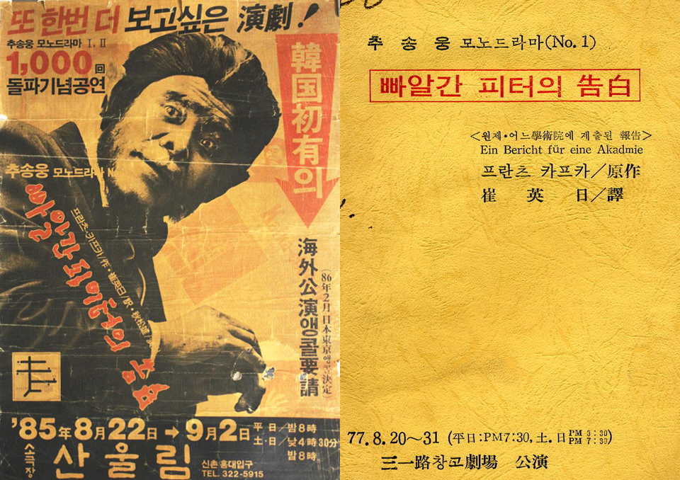 연극 <빠알간 피터의 고백>은 카프카의 단편 <어느 학술원에 드리는 보고(이하 학술원)>를 원작으로 하고 있다. 최영일 씨가 번역한 <빠알간 피터의 고백> 연극 대본은 실제로 원작과 내용이 거의 일치하기 때문에 연극 역시 원작과 크게 다르지 않다. 그렇기에 다양한 해석의 가능성을 제공하는 카프카의 이 원작이 모노드라마로 펼쳐졌다면 그것은 오롯이 배우 추송웅의 연기력을 통해서 관객에게 그 내용이 전달되었을 것이다. 물론 당대의 추송웅은 연극에서는 타의 추종을 불허하는 연기력을 가졌다고 알려졌기에 그의 목소리, 호흡의 끊김, 몸짓 등을 통해서라면 어떤 해석으로 생산된 <학술원>이 되었을까 궁금하기도 하다.