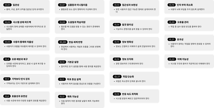 선정된 7가지 이론의 세부 평가항목은 총 76개이다. 개별 항목들을 피그마를 활용하여 카드소팅 기법으로 시각화하였으며, 유사하거나 중복되는 것들은 통합하고, 유사하더라도 평가 초점이 다르거나 고유한 의미를 갖는 항목은 독립적으로 분류했다. 이 과정에서 분석의 정확도를 높이기 위해 GPT를 분석도구로 병행/활용하였으며, 최종적으로 총 22개의 평가항목으로 정제되었다.