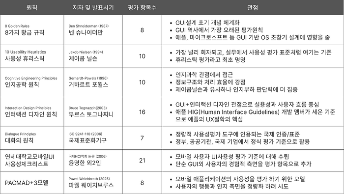 기능 중심의 상호작용 및 인터랙션 평가에 기반한 7가지 이론을 선정하였다. 각 이론의 핵심 요소는 상단 표에 요약되어 있으며, 보다 구체적인 세부 평가 항목은 별도로 정리해두었다. 해당 내용은 하단 링크를 통해 확인할 수 있다.