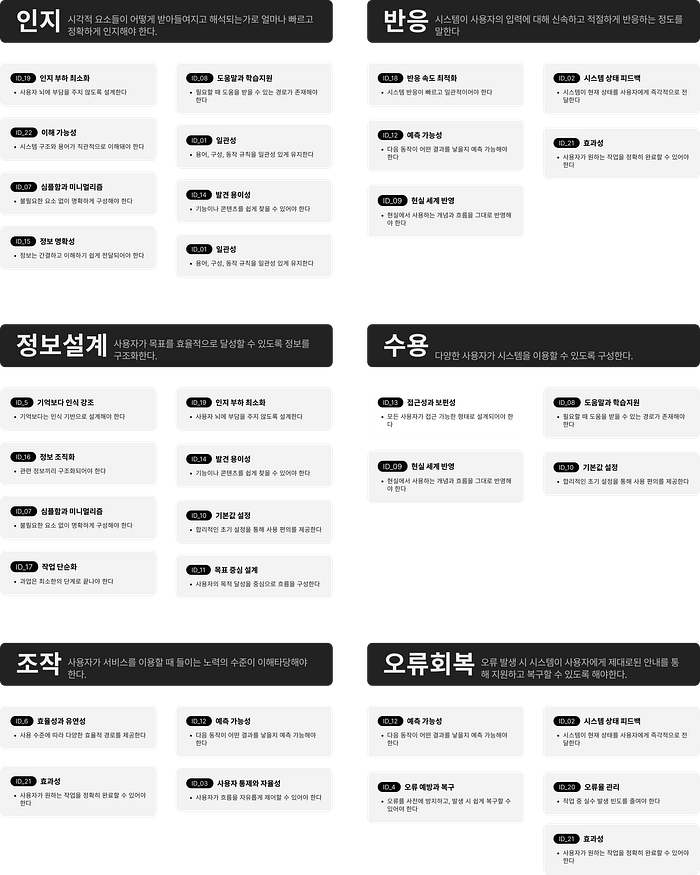 나는 매번 서비스 성격을 고려하여 평가 기준을 수립했는데 어김없이 제이콥 닐슨의 휴리스틱을 참조했다. 그러나 평가 항목을 재정의하고 구분하려고 할 때마다 항목 간 레벨이 상이하고, 적용의 모호함 등으로 어려움을 느꼈다. 그래서 다른 이론들과 비교해가며 적절히 조합하여 적용했다. 이는 자연스러운 결과였다.