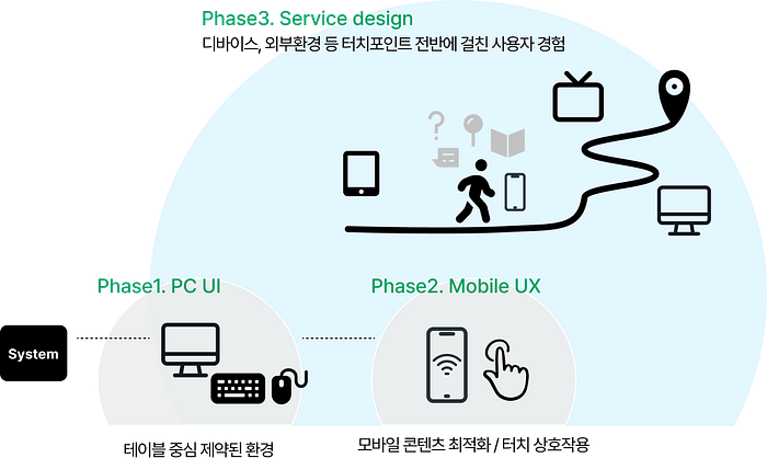 시대의 변화에 따라 UX의 개념과 범주도 진화했다. 초기에는 PC 기반의 사용자 인터페이스와 상호작용에 중점을 두었으며, 이후 모바일 기기의 확산으로 제한된 화면에서 많은 정보를 효율적으로 표현하고, 터치 기반의 인터랙션 설계가 핵심이 되었다. 그 다음 단계에서는 다양한 형태의 디바이스가 일상 전반에 확산되면서 사용자 컨텍스트를 고려한 디바이스 간 상호작용, 나아가 사용자가 서비스를 경험하는 외부 환경까지 아우르는 총체적인 경험의 흐름이 중요한 고려요소로 부상하였다. 이러한 변화 속에서 ‘사용자 중심 디자인(User-Centered Design)’의 중요성은 더욱 강조 되고 있다.