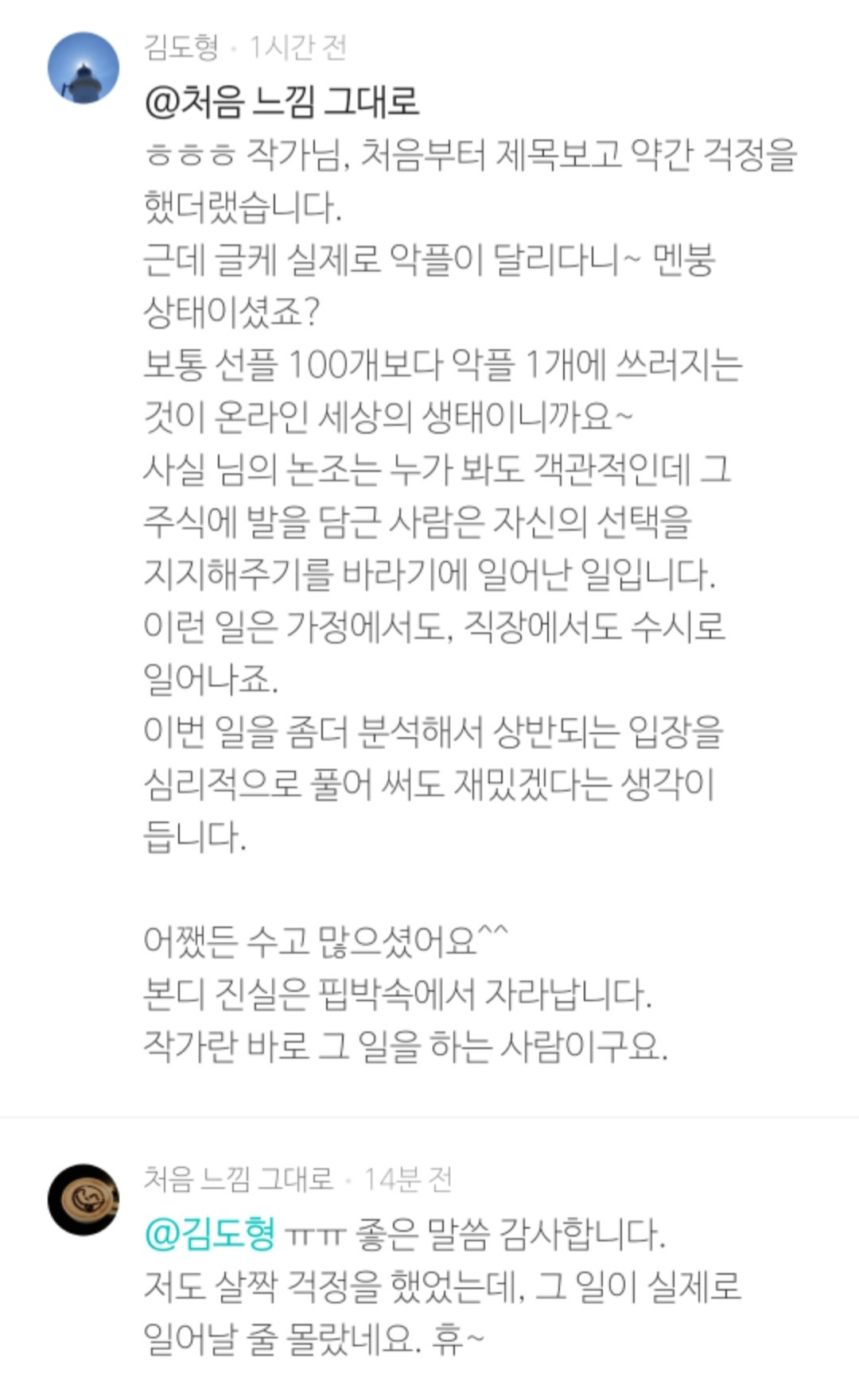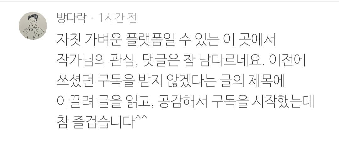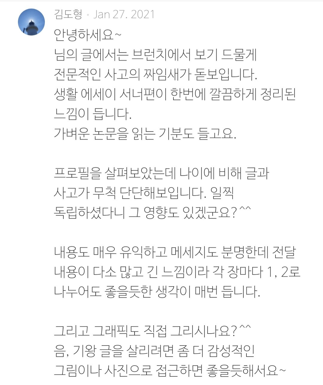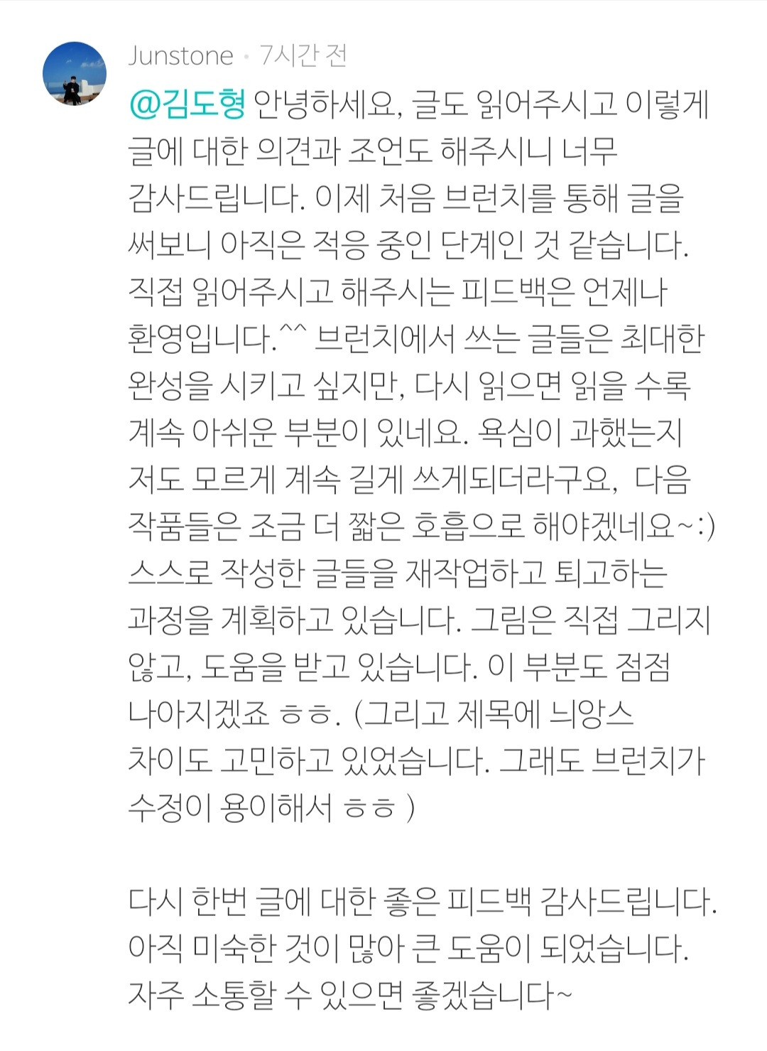 브런치에서 처음으로 받았던 댓글은 그 자체로 소중했다.