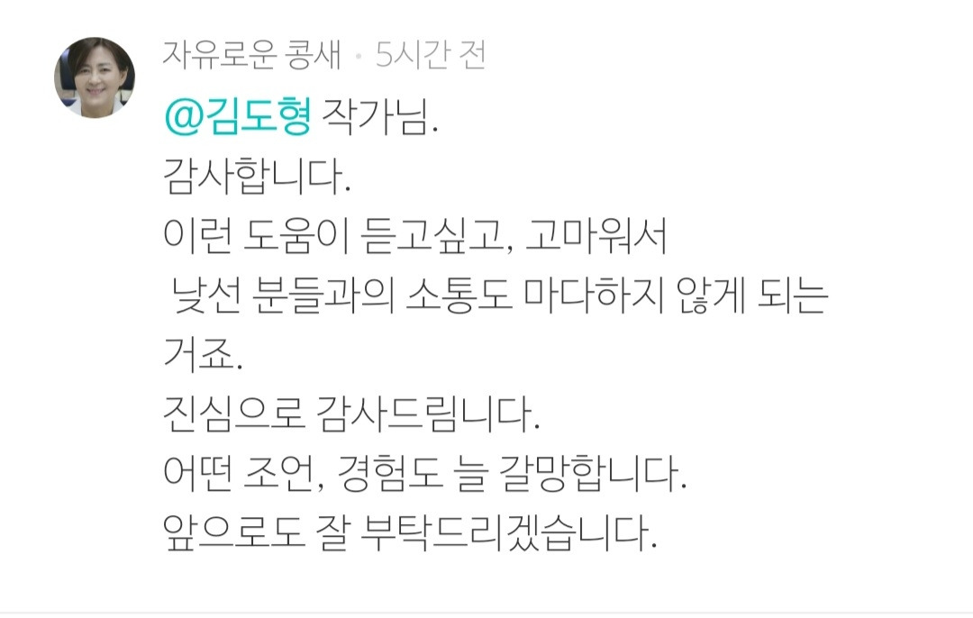 부끄럼 많다는 김해뜻 님은 댓글을 보고는 신이 났나 보다. 그녀의 글은 그만큼 발랄하고 경쾌하다.