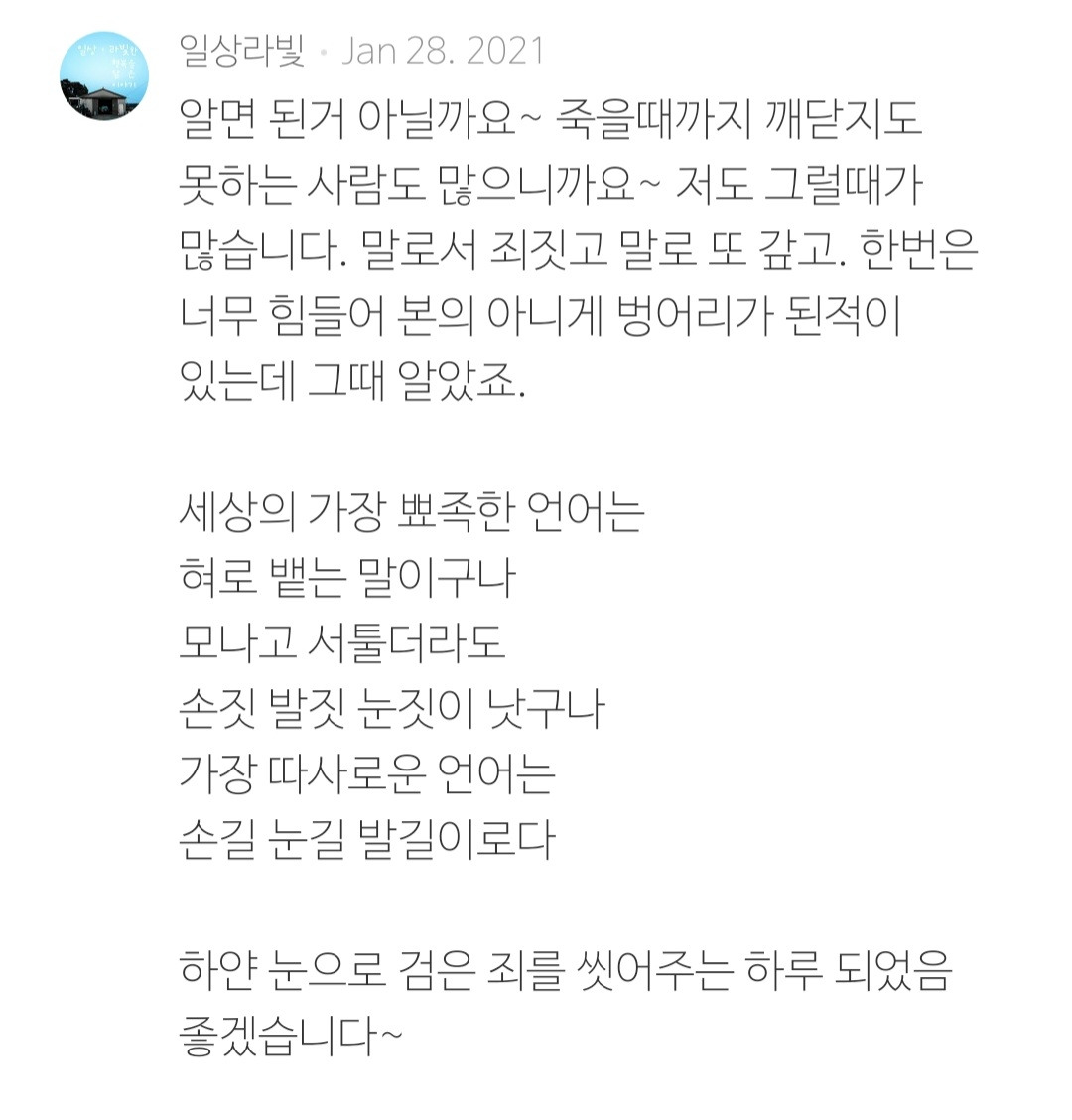 일상라빛 님은 글을 넘어 삶을 비추는 눈동자를 가진 분이다. 너무 좋은 내용의 댓글을 많이 주셨는데 혹시 실례가 될까 하여 아쉽지만 한 컷만 실었다. 다음에 기회가 된다면 님의 댓글 특집을 꾸려보고 싶다.