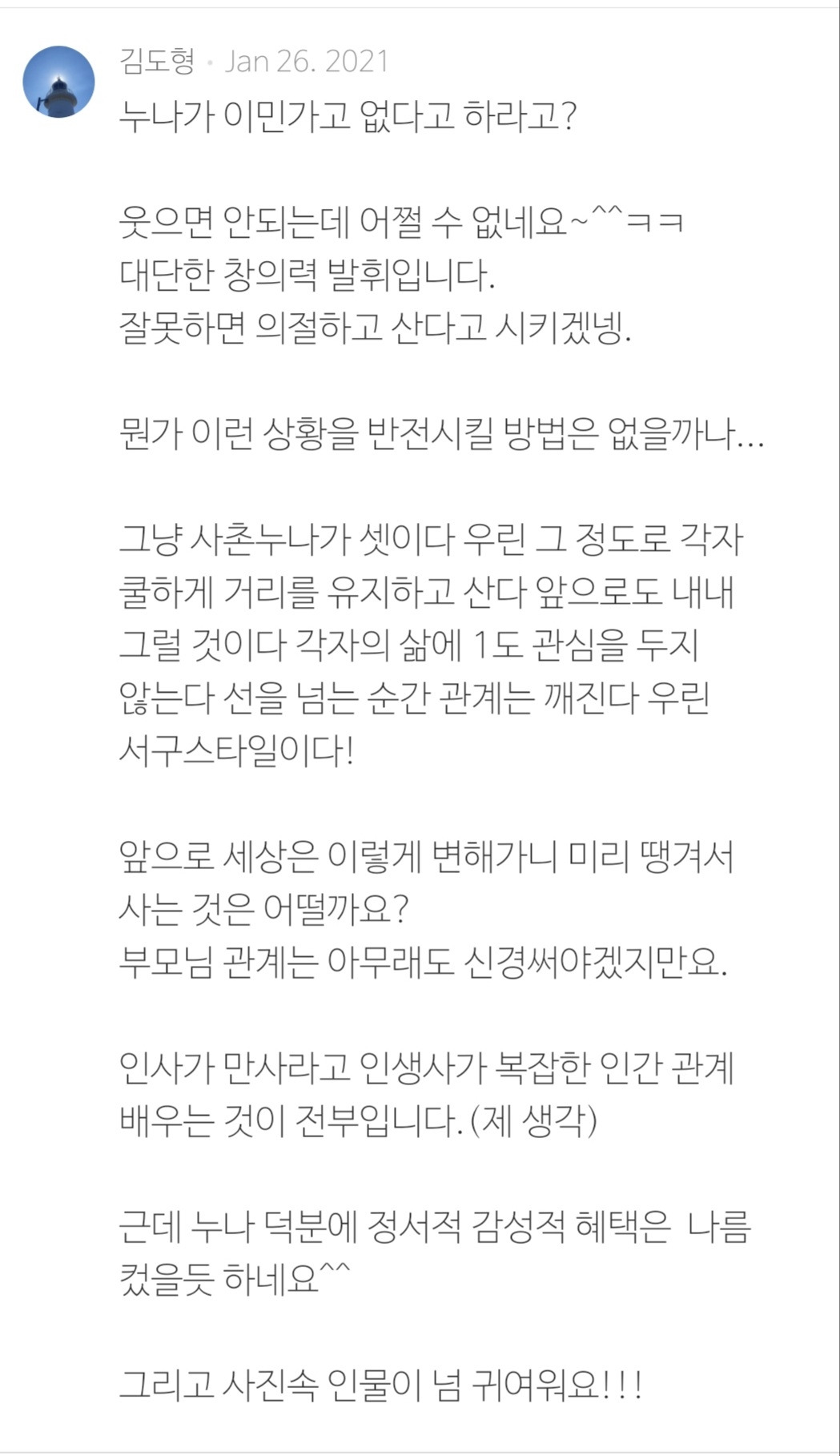처음 느낌 그대로 님은 막내 동생^^ 같아서 자꾸 댓글에 손길이 간다. 댓글 페이지의 단골손님이다.
